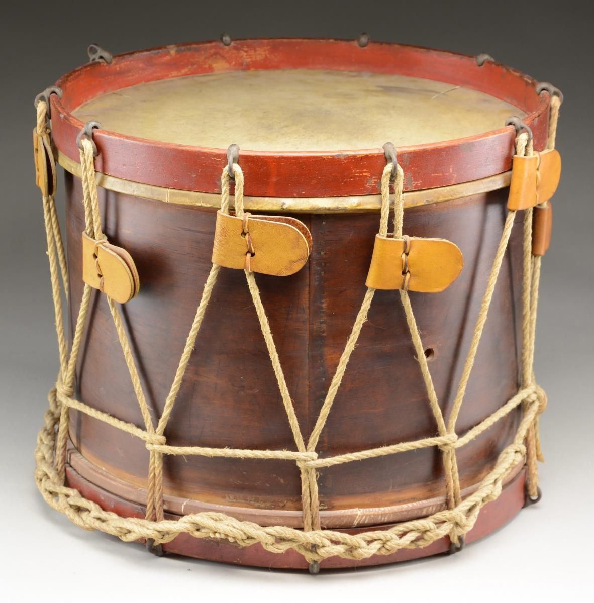 14" high, 16" diameter. Beautiful painted American eagle holding American flag in talons. Heads, ropes, and snares restored. Repair label inside dated 1985, Ralph E. Eames, Wakefield, Mass. CONDITION: very good as restored, painting has some losses but very good also. Top head has about 3" stress tear but still sounds good. PROVENANCE: Martin Lane Historic & Western Americana Lifetime Collection. (02-21508/JS). $2,000-3,000.