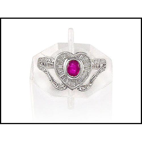 A very pleasing color natural ruby (5mm long) has perfect contrast from the border of 21 white baguette diamonds. 20 additional diamonds in the design create high elegance as set in 18K solid white gold. The center heart measures 12mm x 11 mm. Size 7 is easy to change. A great buyer opportunity!!