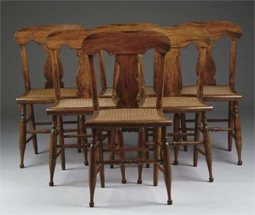 FINE SET OF SIX CANE SEAT GRAIN PAINTED SIDE CHAIRS. Vase back splat, carved rounded crest with turned front legs. 19th Century. A nice clean set ready for in home use. SIZE: 34-3/4” h x 18” seat h. CONDITION: Very good. 9-27689
