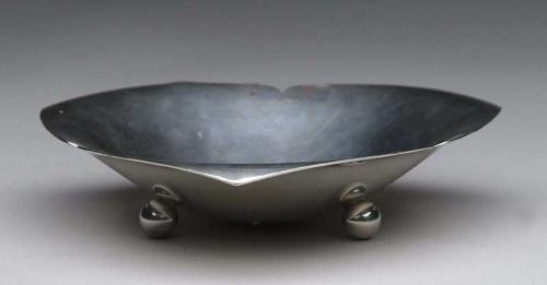 FINE SHAPED FOOTED STERLING SILVER DISH BY TIFFANY & CO. Marked “23376 M”. The triangular shaped petal formed rolled edge dish has three ball feet. WEIGHT: 8 tr. oz. SIZE: 7” dia x 1-1/2” h. CONDITION: Some small dents to edge, generally good. 9-27176