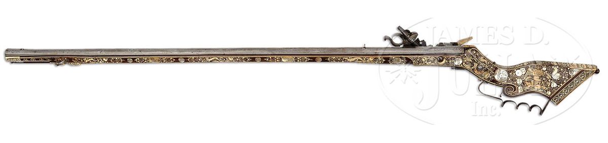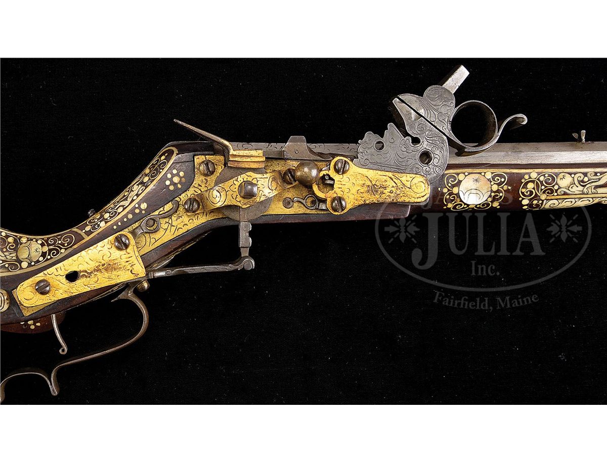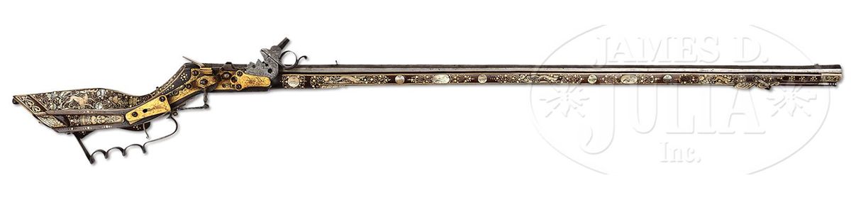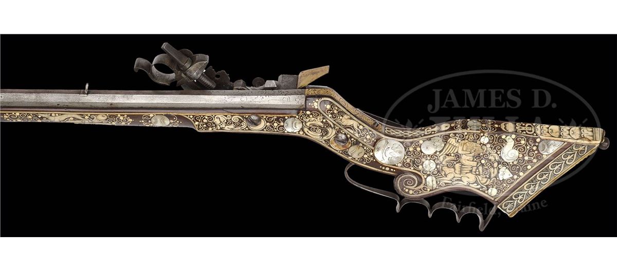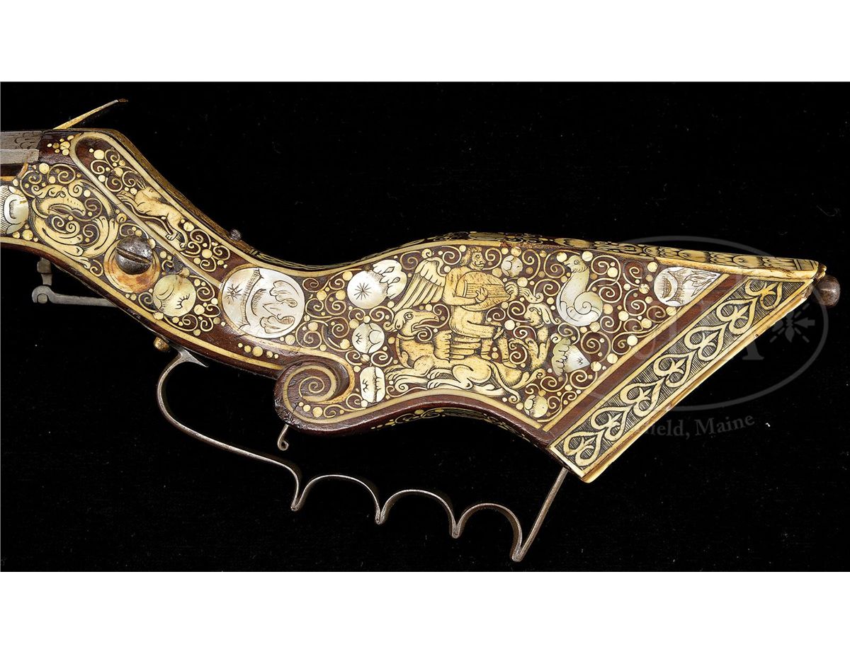 NSN. Unusually good example of this type of wheel lock retaining nearly all of its original bright gilding on lock. The elaborately inlaid fruitwood stock depicts the usual stag, bird and rabbit motif common to Eastern Europe. Inlay is profuse and very attractive. Oct bbl retains some original engraving. Typical small bore. Original trigger guard. Original patchbox. Inlaid en suite. These 17th century Eastern European birding guns constitute a characteristic group and are eagerly collected by enthusiasts of 17th century Eastern European art. PROVENANCE: Collection of Dr. John Hill. Collection of Dr. Douglas Sirkin. CONDITION: As noted except for bbl being cleaned. Exceptionally good for type of gun. Few, if any, missing inlays. Much original gilding. Stock exceptionally fine. Hammer retains all small parts and engraving, much as it left the gunsmith's shop in the 17th century. 4-49751 MZ2