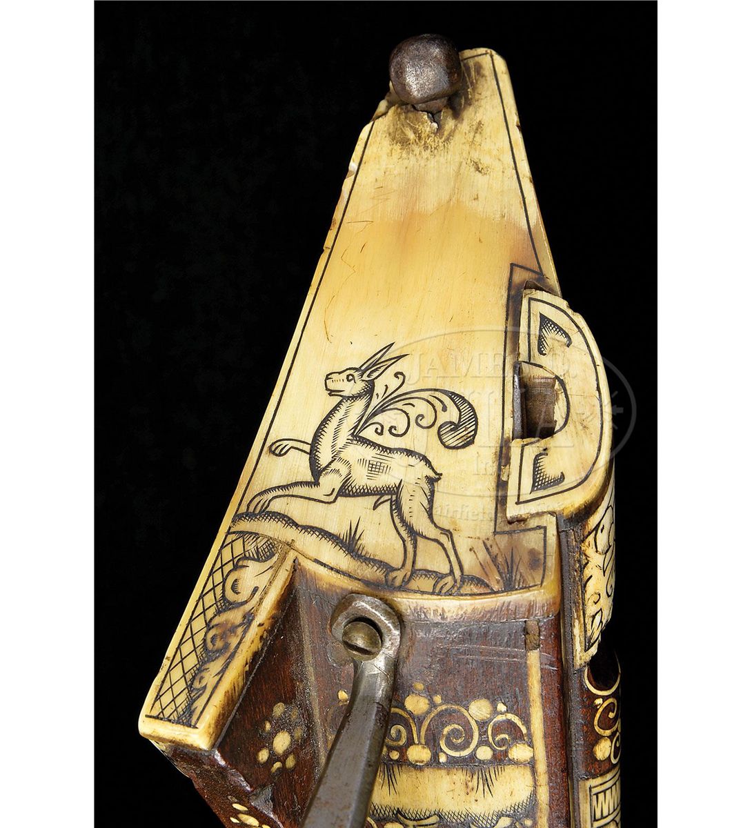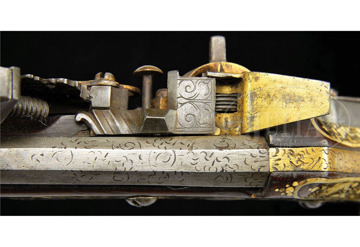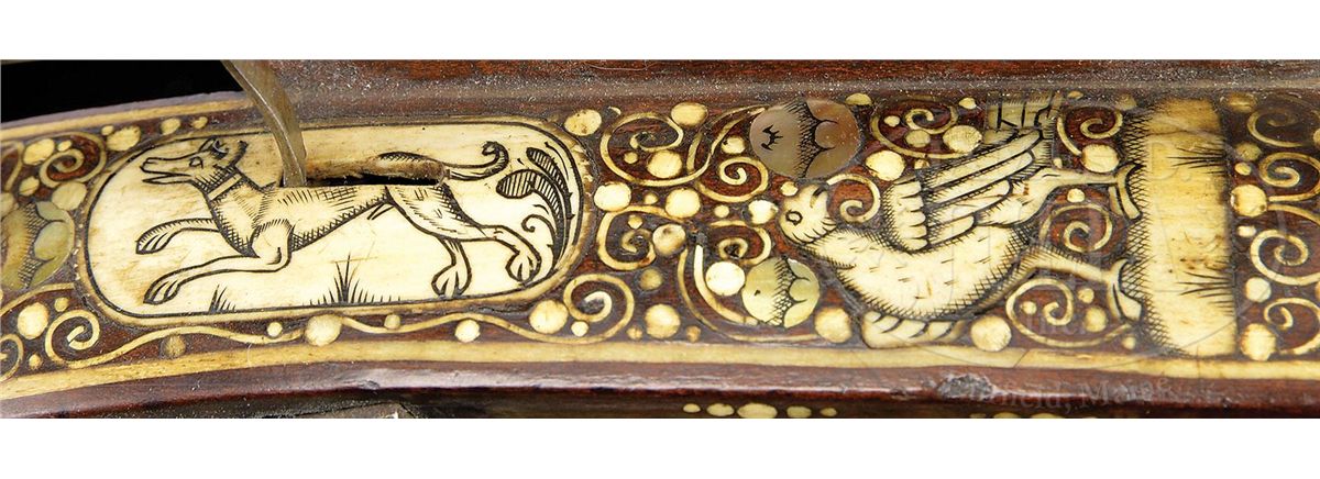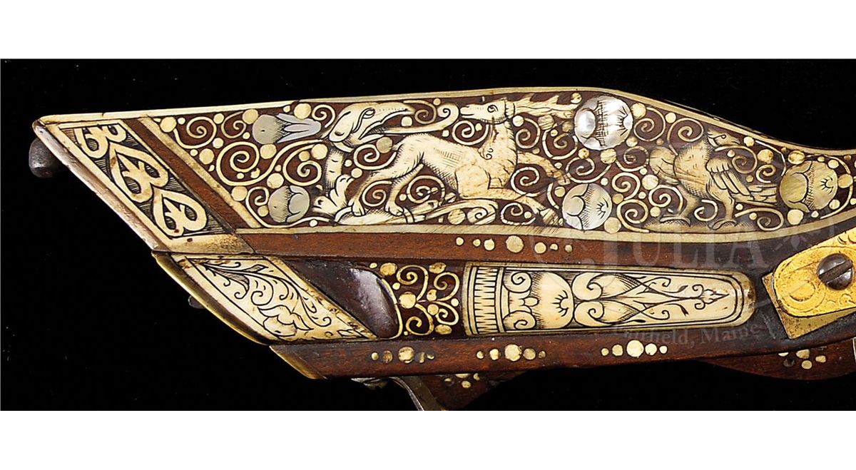 NSN. Unusually good example of this type of wheel lock retaining nearly all of its original bright gilding on lock. The elaborately inlaid fruitwood stock depicts the usual stag, bird and rabbit motif common to Eastern Europe. Inlay is profuse and very attractive. Oct bbl retains some original engraving. Typical small bore. Original trigger guard. Original patchbox. Inlaid en suite. These 17th century Eastern European birding guns constitute a characteristic group and are eagerly collected by enthusiasts of 17th century Eastern European art. PROVENANCE: Collection of Dr. John Hill. Collection of Dr. Douglas Sirkin. CONDITION: As noted except for bbl being cleaned. Exceptionally good for type of gun. Few, if any, missing inlays. Much original gilding. Stock exceptionally fine. Hammer retains all small parts and engraving, much as it left the gunsmith's shop in the 17th century. 4-49751 MZ2