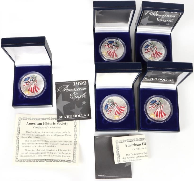 Fine silver 1999 Colorized 1 oz American Eagle W/ COA and Box for each coin.
