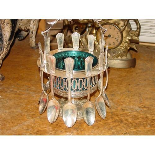 I AM NOT SUE OF THE USE OF THIS SERVING BOWL WITH THE 12 HANGING SPOONS BUT IT SURE IS LOVELY, THE EMERALD COLOR BOWL IS HAND BLOWN AND IN PERFECT CONDITION, THERE IS NO MAKERS MARK ON ANY OF THE SILVER PLATE BUT IT APPEARS TO BE OF HIGH QUALITY AND VERY GOOD CONDITION, THERE IS VERY LITTLE WEAR.