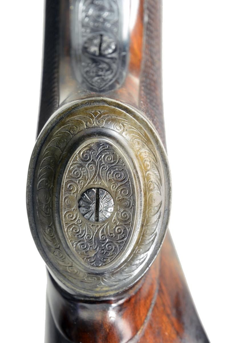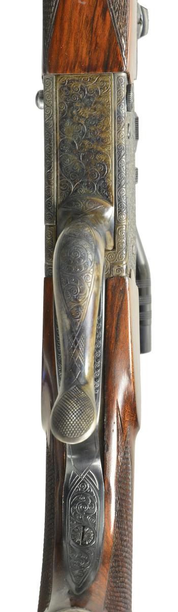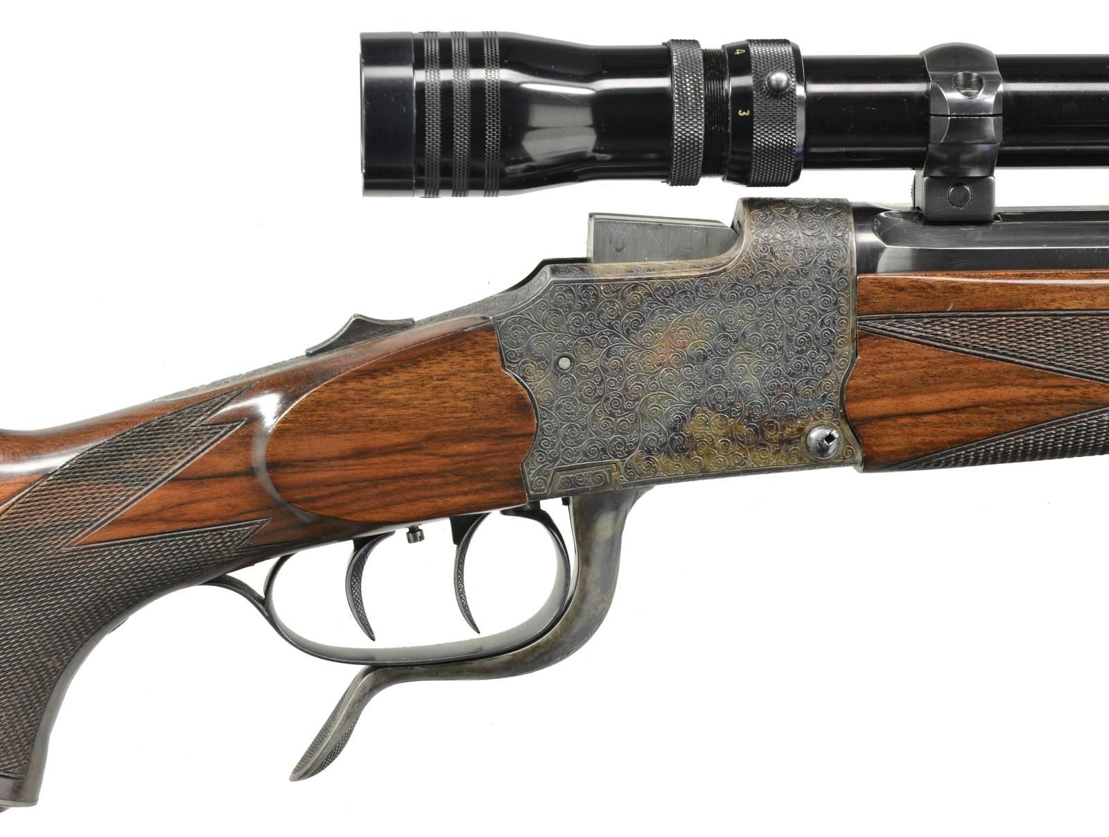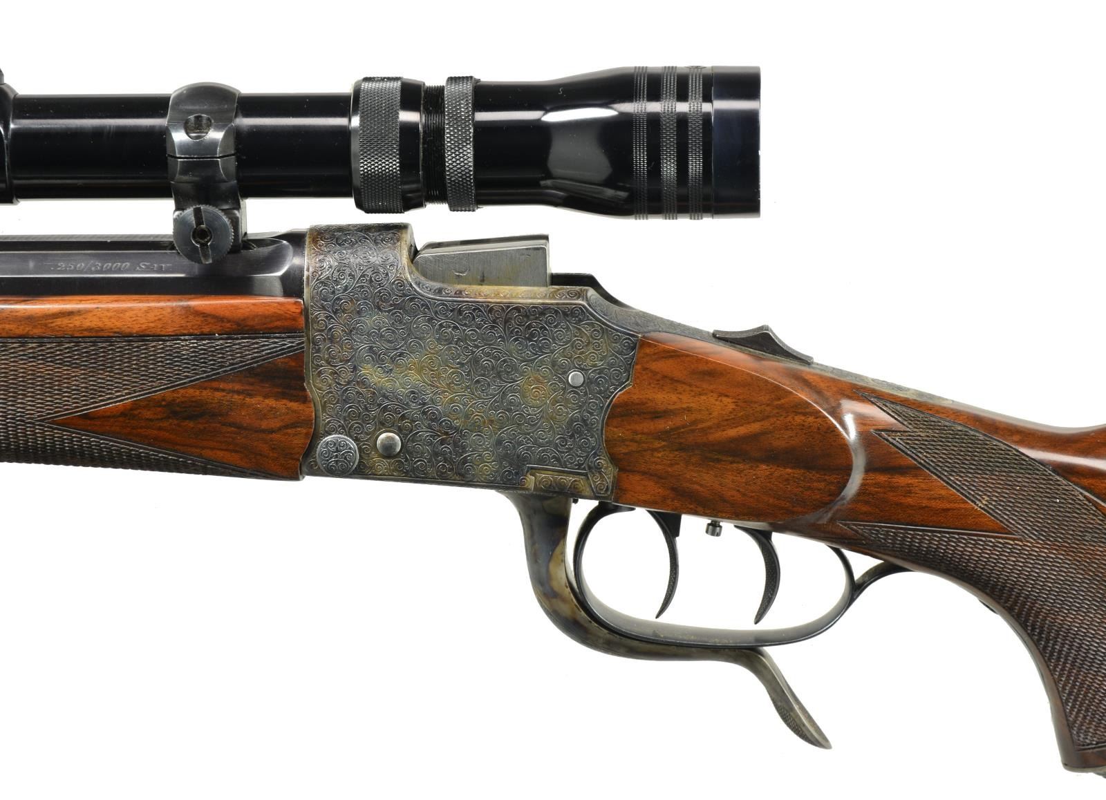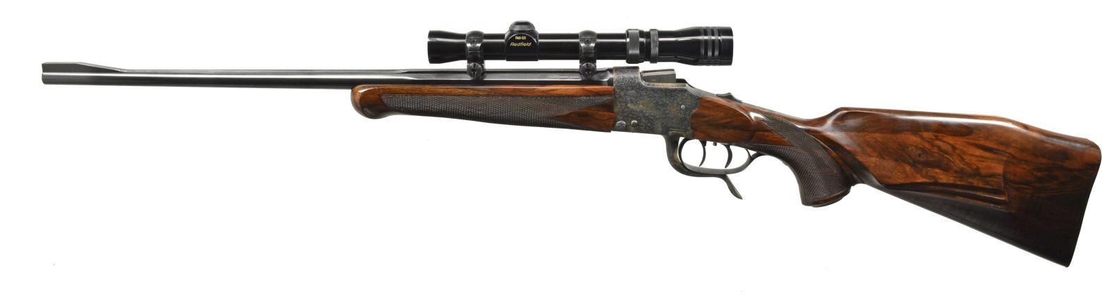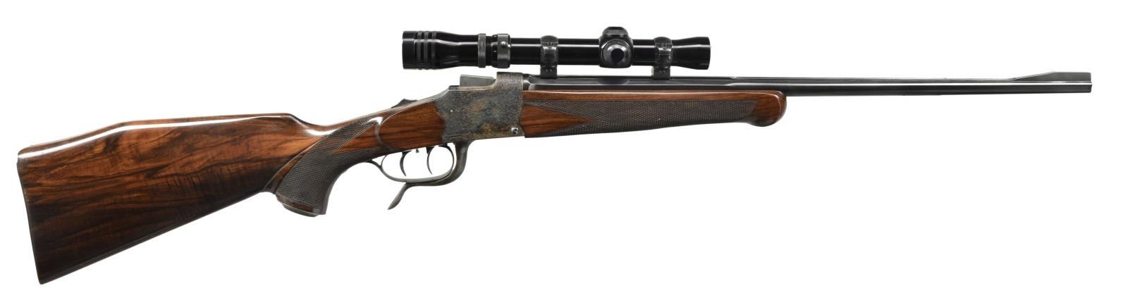 W/ GRIFFIN & HOWE BBL. & TYROLIAN STYLE STOCK W/ SCOPE. Cal. .250/3000. S# 306. 1/3 Octagonal 22" bbl. w/ matted integral rib is engraved "No. 306 GRIFFIN & HOWE INC. NEW YORK" in milled out portion of rib. There are 2 extra milling cuts taken at front portion of rib to narrow & further shape it. Raised ramp front portion is uncut for front sight. Rear portion is milled to accept steel .22 rimfire type rings & holes are drilled in rib for anti-recoil studs. Bottom of bbl. is stamped "Germany" w/ Krupp steel info & "WK" along w/ number "40844"; there are no German proofs. Case hardened action is unproofed & unnumbered, & features top tang safety & double set triggers w/ checkered finger blades. Operating lever & breech block are easily removed by removing a transverse pin. Action engraved w/ full coverage well cut semi relief shaded scroll. Nicely mottled & figured European walnut, steel capped pistol grip buttstock measures 14 1/4" over checkered steel Neidner buttplate & features Tyrolian styling w/ slight "Monte Carlo" comb, double fluted right hand cheekpiece, chin strap transition to grip & well cut closely spaced point pattern checkering. Matching forend w/ schnabled tip attaches to bbl. w/ screw from bottom. Scope is a 1 3/4x 5 "Widefield" by Redfield w/ duplex reticle. WEIGHT: 7 lbs. 7 oz. w/ scope. CONDITION: very fine. Bbl. retaining nearly all of a reblue, engraving somewhat softened. Action retains over 90% of its original case hardening color. Stocks retain nearly all their original rubbed oil finish. Bore is fine to very fine w/ some scattered light pitting toward muzzle. Scope is very fine w/ some marks on the exterior, & is optically clear. A very fine lightweight little rifle. (20-1669/MGM58). CURIO. $3,000-6,000.