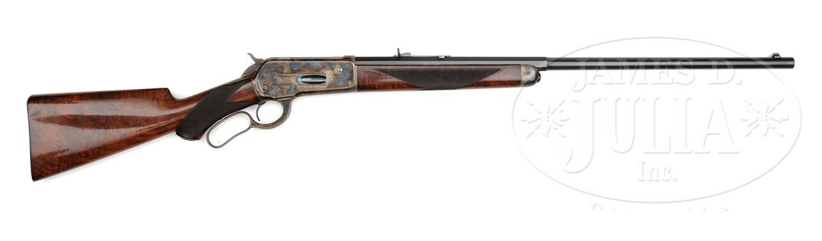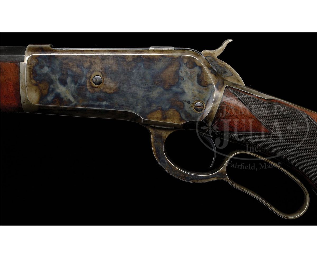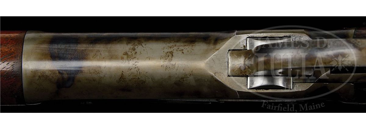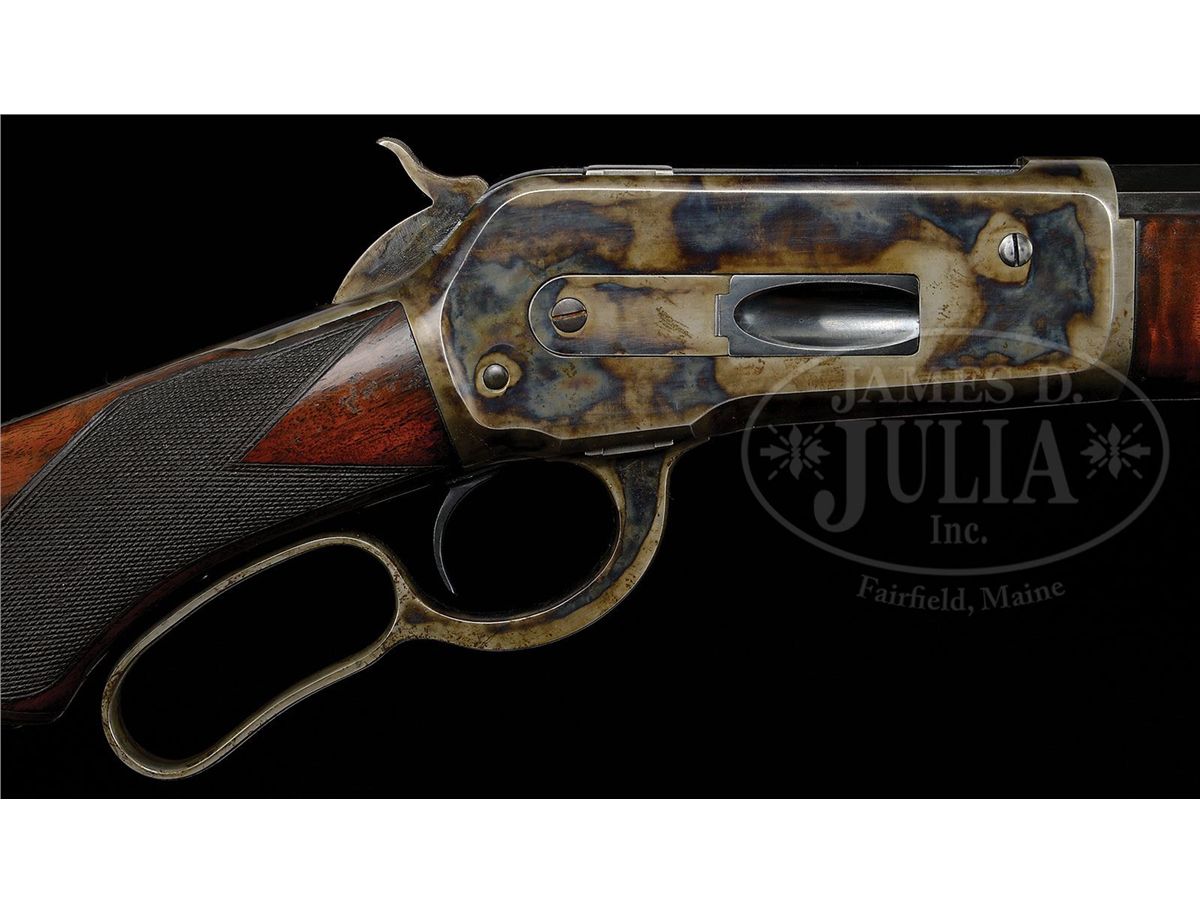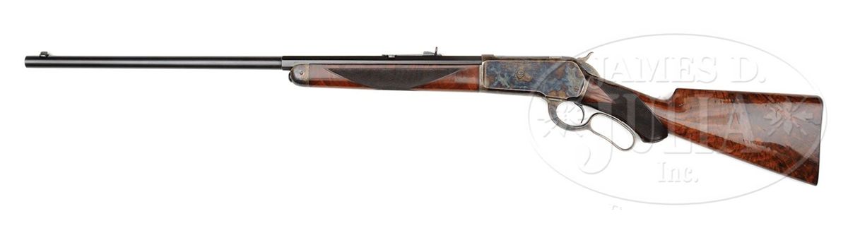 SN 110499. Cal. 45-70. Beautiful deluxe '86 with 26" oct to rd bbl, button magazine, Lyman gold bead front sight and semi-buckhorn rear sight. Mounted with very highly figured, 2-3X flame grain American walnut with H-style checkered forearm and capped pistol grip stock with smooth steel buttplate. Left side of the lower tang is marked "XX" and with the assembly number "98". Matching assembly number is also found in the top tang channel of the buttstock. Inside toe of buttplate is marked with the assembly number "975". The metal on this rifle has been completely restored by Turnbull Restorations. Wood however remains untouched with orig finish. CONDITION: Very fine. Bbl & buttplate retain strong, bright orig Winchester-type blue. Receiver, lever, hammer & forend cap retain about all of their custom, brilliant, Winchester-style case colors. Wood is sound with a few minor nicks & scratches in the finish, showing light diamond-point wear and retains virtually all of its brilliant, orig, piano varnish finish. Mechanics are crisp. Brilliant, shiny bore. 4-48917 JR153