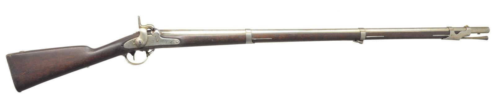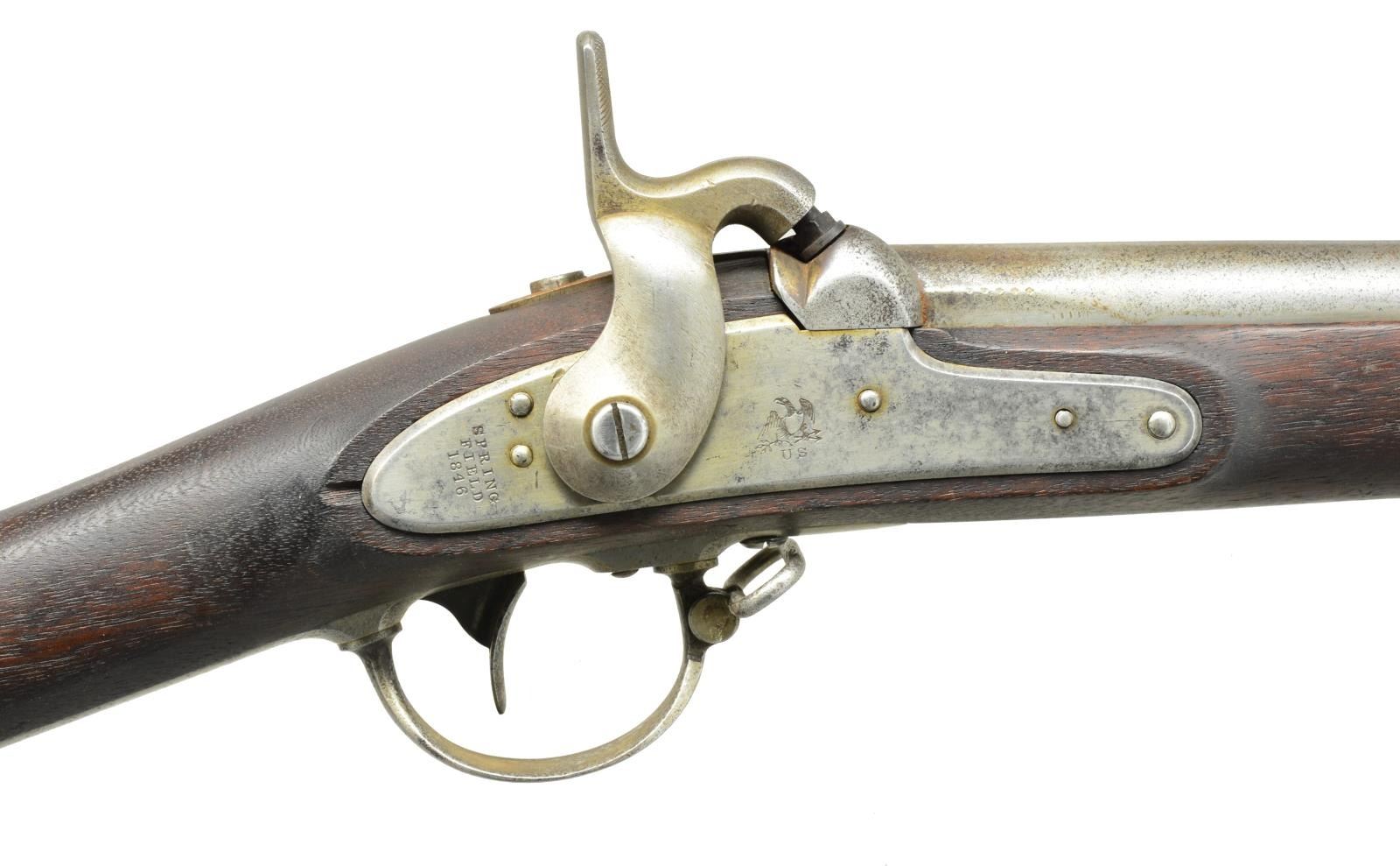 Cal. 69. NSN. Bbl. 42". Standard configuration, Springfield 1846 dated lock & bbl., inspected breech w/ “VP” eagle head proofs. Two inspectors cartouches. CONDITION: fine overall. Metal is mostly smooth gray w/ exception of buttplate which is pitted. Markings are crisp, as can be seen in photos. Bbl. tang appears replaced & restamped. Mechanics are crisp w/ bright smooth bore. PROVENANCE: The Estate Collection of Gary Parietti. (01-19287/JS). ANTIQUE. $1,200-1,800.
