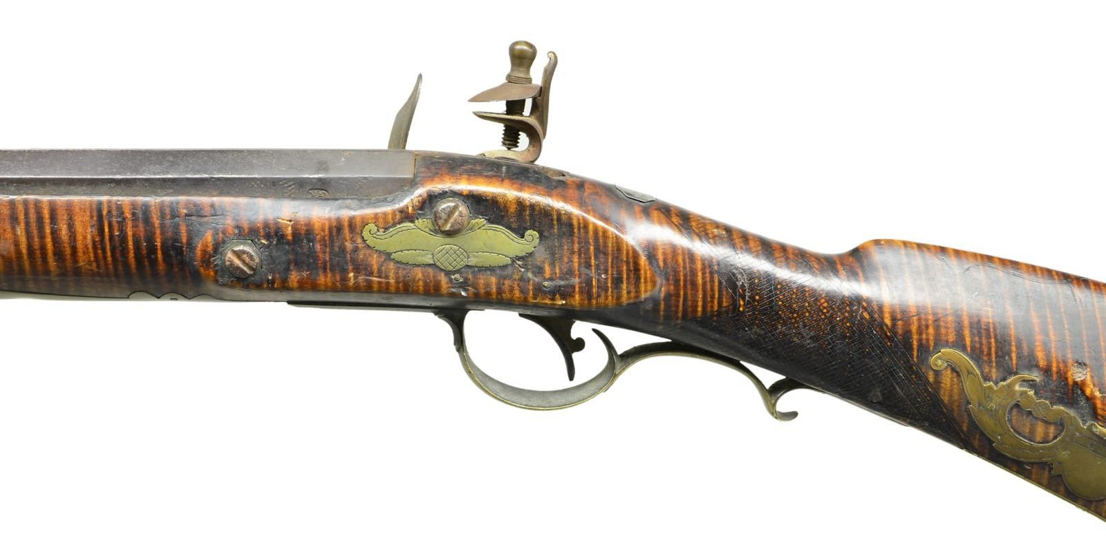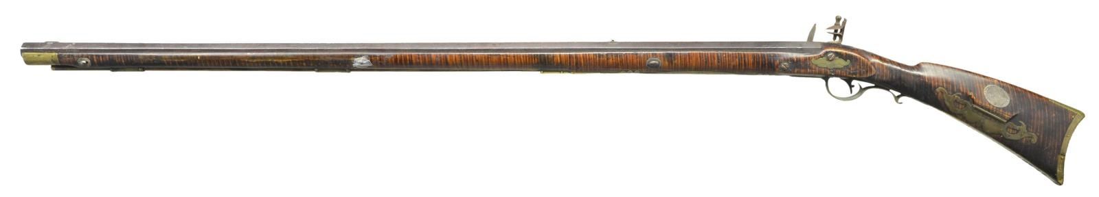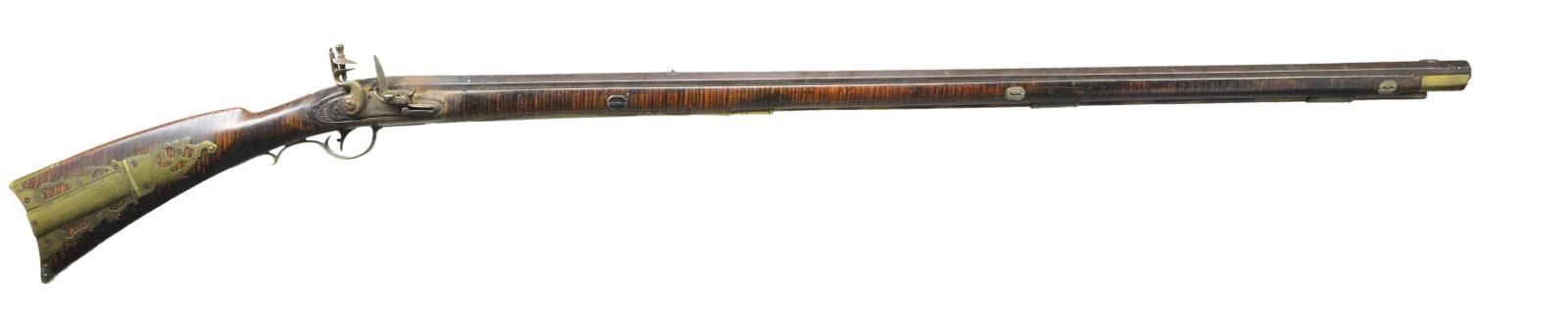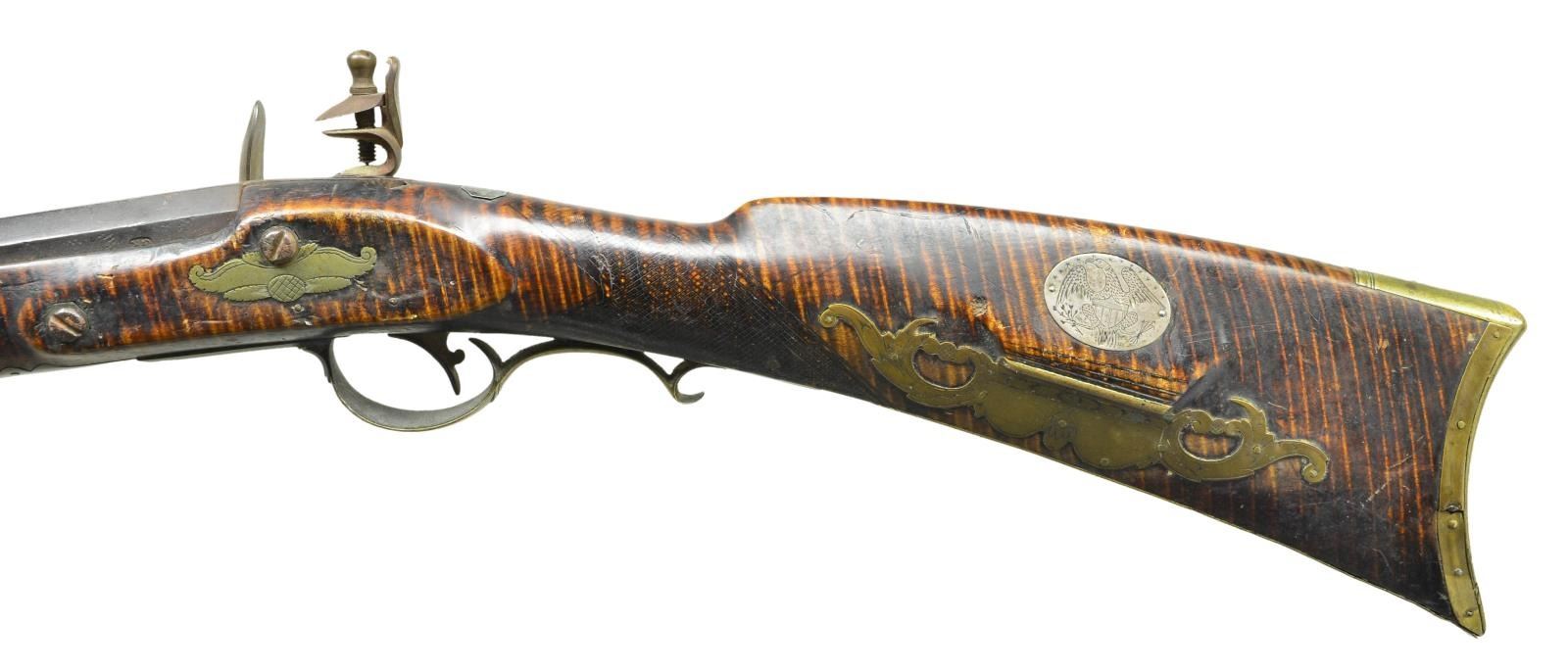 “PHILADELPHIA SCHOOL” KENTUCKY RIFLE. Cal. 52. NSN. 58” overall, 42.5” octagonal, large bore smooth rifle marked “H. DERINGER / PHILAD”, fixed rear sight, inset silver front blade sight. Rebated flint lock also “DERINGER marked. Engraved patchbox with 8 piercings, checkered wrist, engraved & pierced brass escutcheon below cheek piece with vent pick holder, silver oval engraved eagle plaque on cheek piece, small vacant octagonal thumb plate, fine curly maple full stock, sculptured wear plate covers all wood between trigger guard and ramrod thimble, pierced toe plate covers all wood between buttplate and trigger guard.