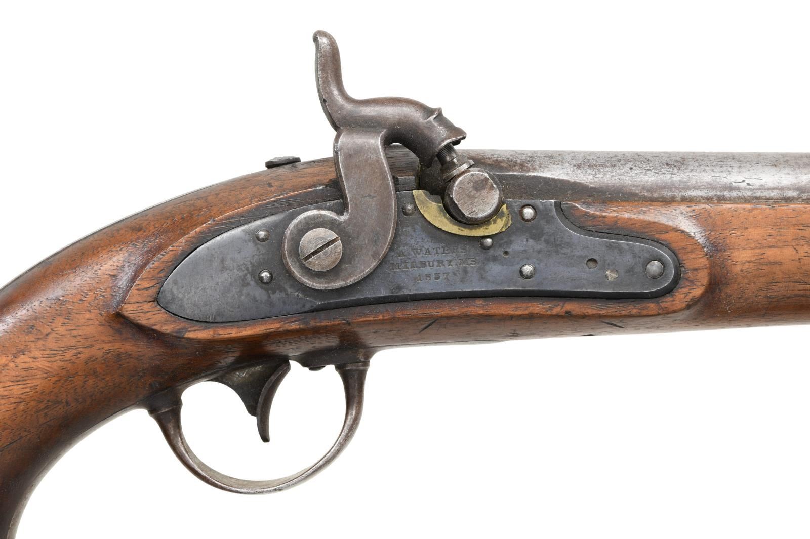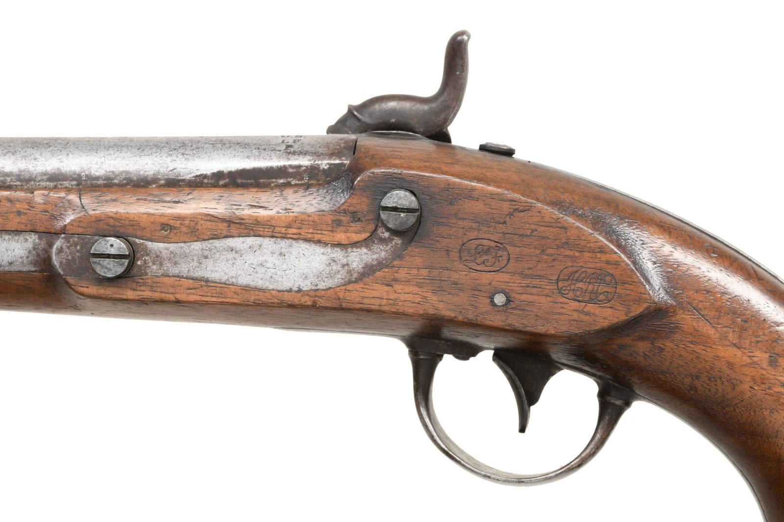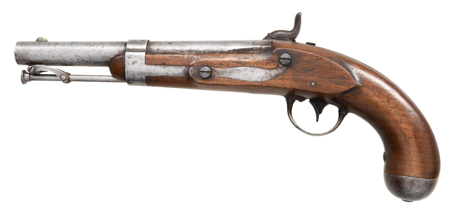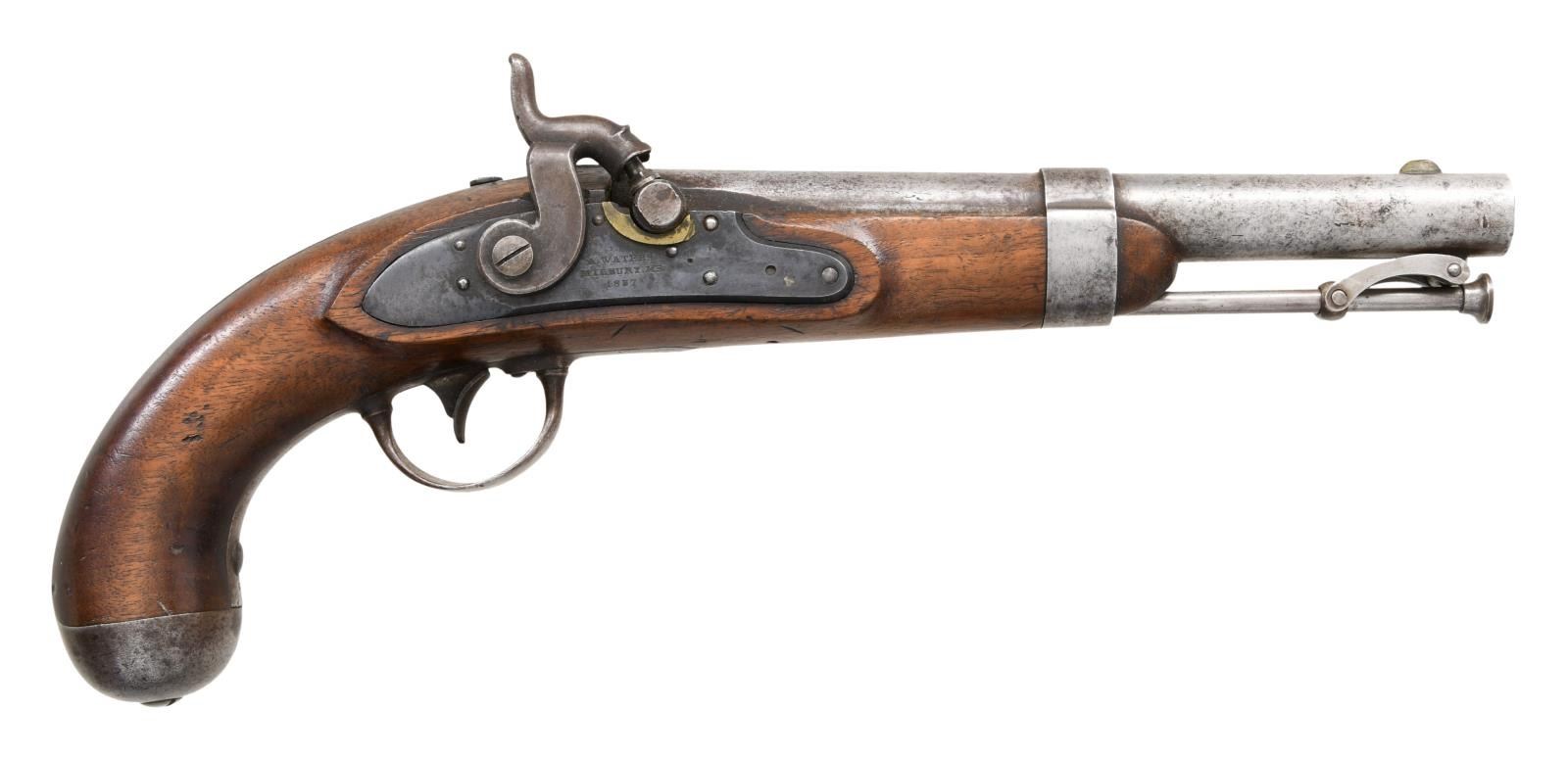 SINGLE SHOT MARTIAL PISTOL. Cal. 54 NSN. 1837 dated percussion conversion in standard configuration with drum bolster, 8.5" barrel, "US / LF / P" proofs on left breech. This is a superior survivor with 2 bright inspector cartouches and scattered inspection initials on most every part. "A. WATERS / MILBURY MS / 1837" marked lock, captured ramrod assembly. CONDITION: very good-fine overall. Metal is mottled gray patina, markings crisp. Stock is sound, well fit, sharp edges, crisp cartouches. Mechanically fine w/ clean smooth bore.(01-23813/JS). ANTIQUE. $600-800.