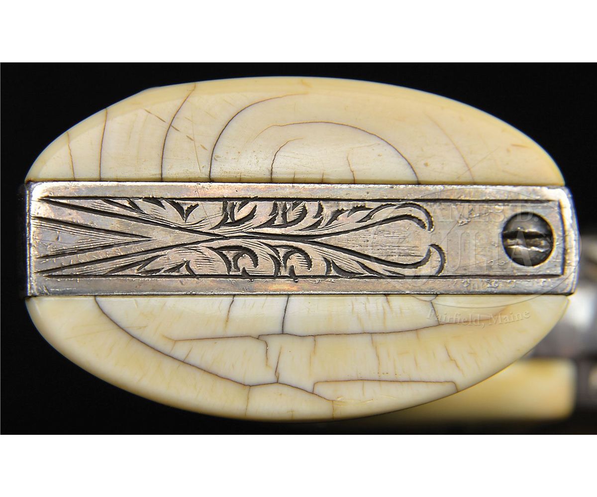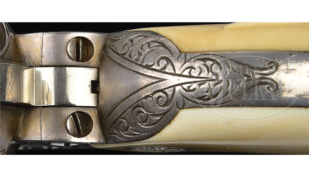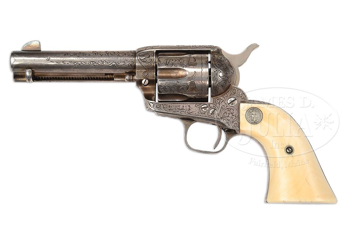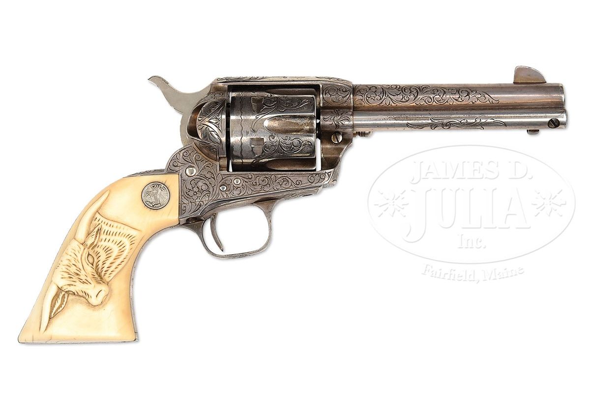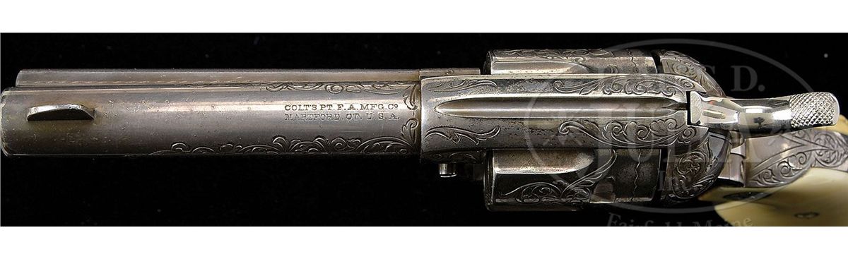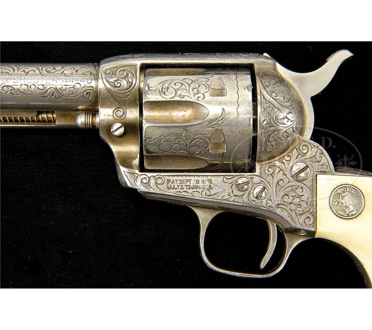 SN 350108. Cal. 44 WCF (44-40). Silver finish with 4-3/4" bbl, full front sight and 2-line address with roll marking on left side "COLT FRONTIER SIX SHOOTER 44-40". Left side of frame has 2-line, 3-patent dates and rampant Colt. Mounted with 2-pc silver medallion ivory grips with raised carved ox head on right side. Right side of front & backstraps, under the grip, are marked with matching SNs and rear face of cyl has last two digits of matching SN. Revolver is engraved in Mr. Glahn's distinctive style of intertwined foliate & floral patterns which also incorporate his distinctive "V" patterns. Frame has about 60% coverage with matching patterns extending up both sides of the bbl and on the outer radius of the ejector housing with a snake pattern in the top gullet. Backstrap, buttstrap & trigger guard are engraved to match. Cyl has matching patterns on the lands between the flutes and has a snake pattern around rear edge. This revolver will letter in caliber 44 with 4-3/4" bbl, silver finish, Grade 2 engraving with ivory stocks, carved steer head motif, shipped to Richards & Conover, Kansas City, MO, Oct. 18, 1926. It appears that the screws & hammer may be nickel finish while the balance of the revolver is silver. CONDITION: Very fine, all matching except grips which are unnumbered. Overall retains about 95% strong orig silver finish showing holster wear on left muzzle edge of the bbl and tip of ejector housing; front face of cyl has lost most of its silver; front & back straps have some light pimpling. Grips have several age lines, show light wear and retain a fine ivory patina. Mechanics are crisp, strong bore with fine frosty pitting. 4-48784 JR348