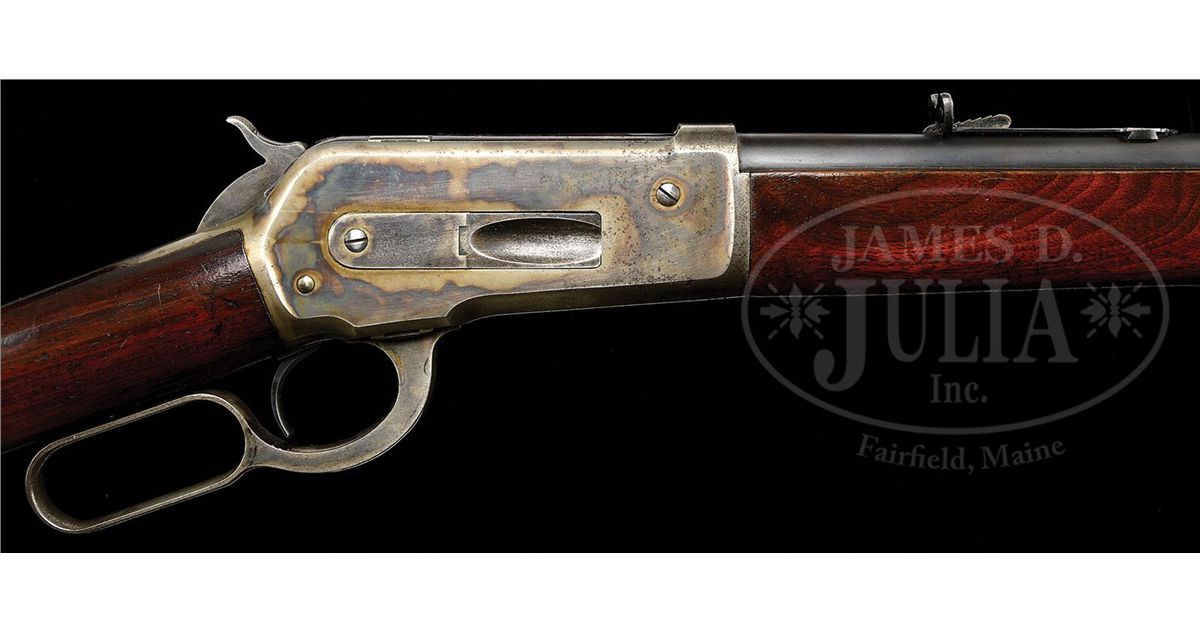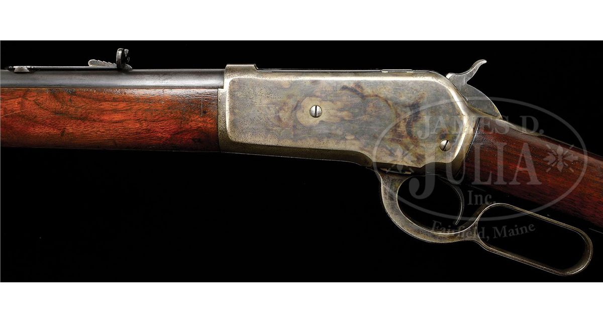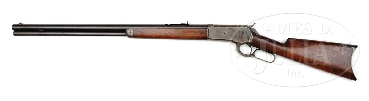 SN 71549. Cal. 38-56. Standard grade rifle with 26" rd bbl, full magazine, half nickel front sight & semi-buckhorn rear sight. Bbl has standard address and caliber markings. Mounted with uncheckered, straight grain American walnut with straight stock and crescent buttplate. This rifle will letter, as found. Received in the warehouse Nov 12, 1892 & shipped Nov 22, 1982 to order number 10356. Standard grade '86's were usually working tools of the common man & are rarely found with high orig finish, especially those with color case hardened frames. Exposure to sunlight rapidly fades the colors, turning them silver so being a working tool in the great outdoors exposed these rifles to the ultraviolet rays of the sun which rapidly faded them to silver. CONDITION: Very fine, all original. Bbl & magazine tube retain 94-95% strong orig blue with a few scattered spots of pin prick pitting near the muzzle end. Receiver retains 60-70% orig case colors, fairly bright on the right, thin colors over the top & turned silver on the belly. Hammer retains strong case colors. Lever retains strong case colors on the sides and in sheltered areas, turned silver on the outer faces. Buttplate is a gray patina. Wood is sound with light handling & use nicks and scratches and retains most of it's orig finish, dull on the forearm. Mechanics are crisp. Bright shiny bore. 4-48916 JR150