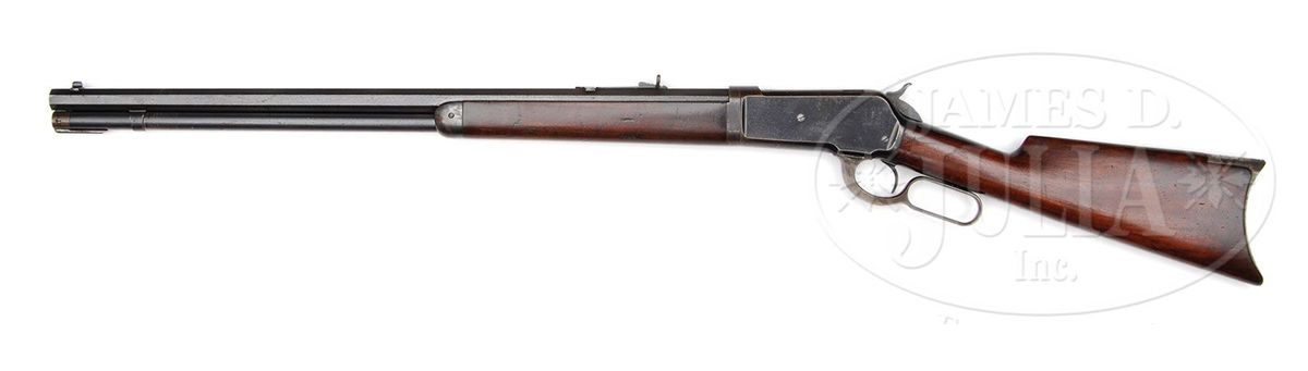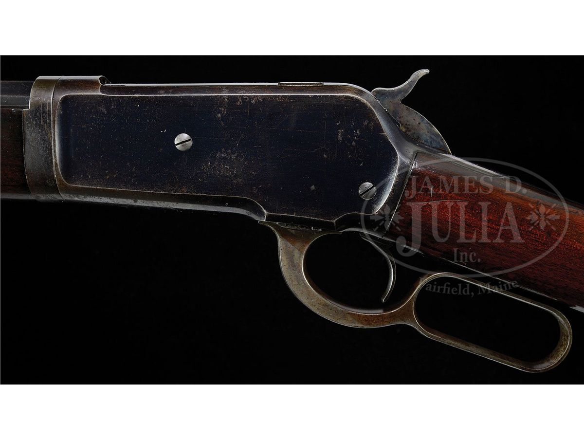 SN 88092. Cal. 40-65. Standard grade takedown rifle with 26" oct bbl, full magazine, Lyman ivory bead Jack front sight and semi-buckhorn rear sight. Mounted with nicely figured, uncheckered straight grain American walnut with straight stock & crescent buttplate. CONDITION: Fine to very fine. Bbl & magazine tube retain 95-96% strong orig blue with scattered light freckles of surface rust and some thinning over the chamber area; takedown ring retains about 90% thinning orig blue and the receiver 92-93% strong blue with sharp edge wear and some thinning over the top & bottom edges; hammer retains strong case colors and the lever bright case colors in sheltered areas, turned silver elsewhere; buttplate is silvered case colors with rust pitting on the heel. Wood is sound with a few nicks & scratches and the buttstock retains almost all of its strong orig finish; forearm is a hand worn patina. Mechanics are crisp, bright shiny bore with some very minor, scattered orange peel pitting. 4-48107 JR340