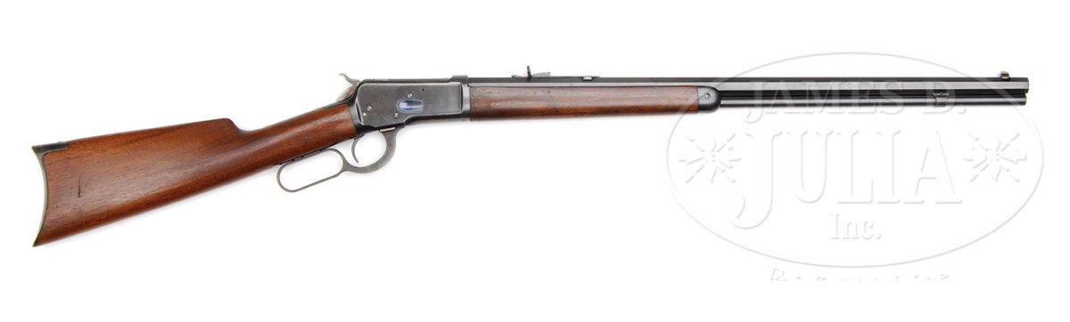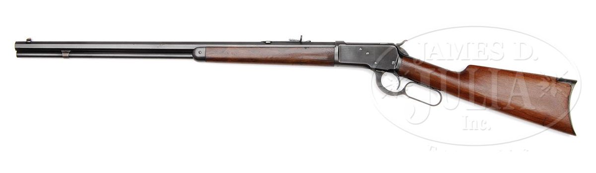 SN 360406. Cal. 32 WCF (32-20). Standard grade rifle with 24-1/4" oct bbl, full magazine, half nickle front sight with screw and semi-buckhorn rear sight. Mounted with uncheckered, straight grain American walnut with straight stock and crescent buttplate. Forearm has exceptional grain which is unusual on a standard grade rifle. Accompanied by a Cody Firearms Museum letter which identifies this rifle, as found, received in the warehouse Feb 7, 1907 and shipped the next day to order #91680. CONDITION: Extremely fine plus. Bbl & magazine tube retain about 98% strong orig blue with only light sharp edge wear and a couple of small nicks. Receiver retains 96-97% bright original blue with sharp edge wear and light thinning to the belly. Top tang is flaked. Hammer retains brilliant case colors and the lever strong case colors, faded on the outer faces. Buttplate retains smoky case colors. Wood is sound with 2 or 3 scratches on the buttstock and a couple of others on the forearm and overall retains about all of its bright original finish. Mechanics are crisp, shiny bore. 4-48109 JR275