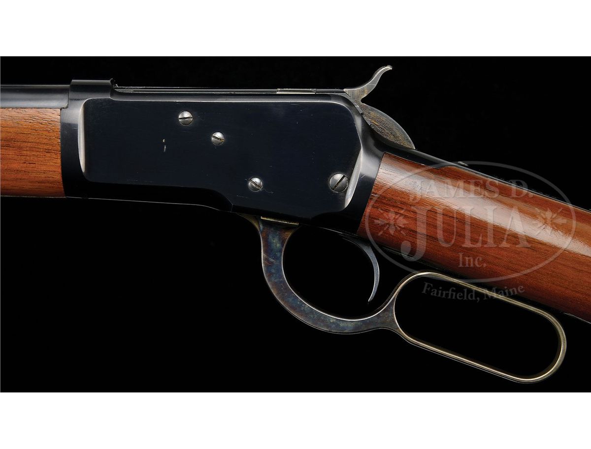 SN 445790. Cal. 32 WCF (32-20). Standard grade rifle with 24-1/4" rnd bbl, full magazine, half nickel front sight with screw & semi-buckhorn rear sight. Mounted with uncheckered, straight grain American walnut with straight stock & crescent buttplate. Produced in 1908 when transportation was generally by horseback, wagon or buggy and firearms were exposed to harsh weather & conditions. This caliber was considered a ladies or boys rifle and as such usually reflect the lack of care & abuse by these inexperienced shooters. They are usually found with little or no orig finish. PROVENANCE: Woody Frey Collection. CONDITION: Extraordinarily fine, crisp, new & unfired. Overall retains 99% plus glossy, orig blue, brilliant case colors and bright orig varnish on the wood. Loading gate retains virtually all of its bright fire blue. Receiver has a couple of tiny scratches & the buttplate is moderately faded. A truly beautiful rifle. 4-48471 JR234
