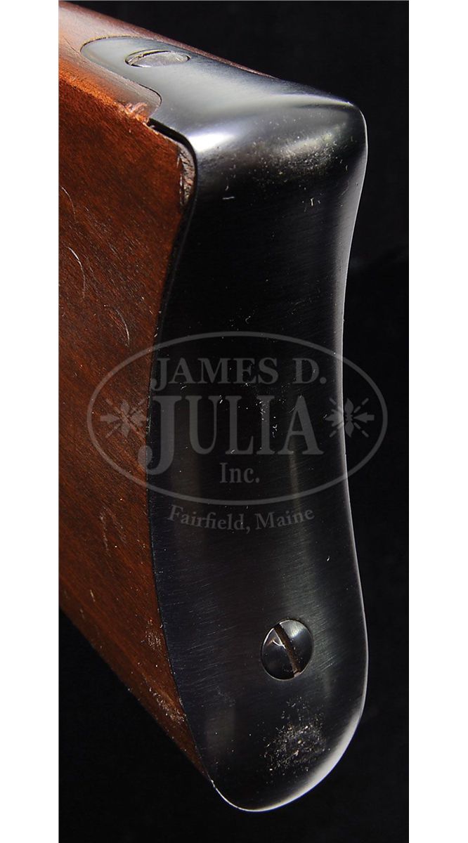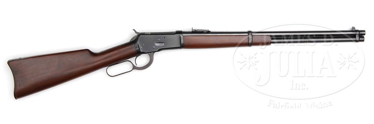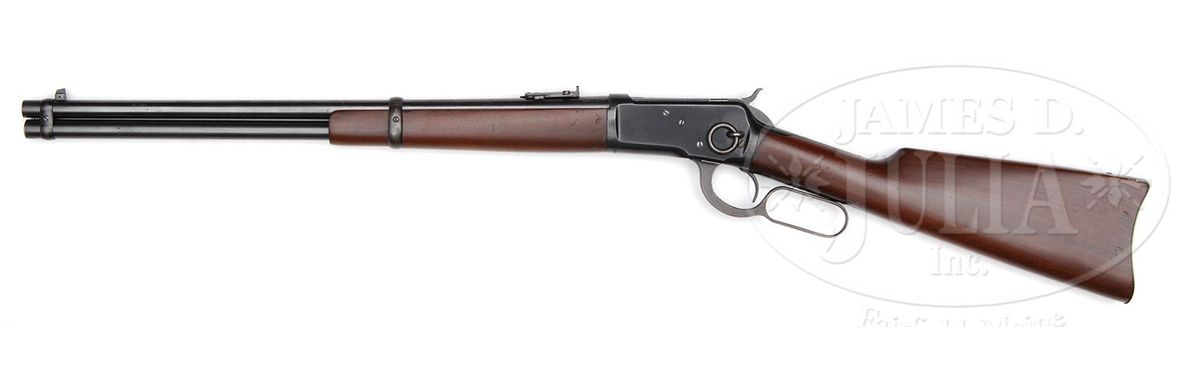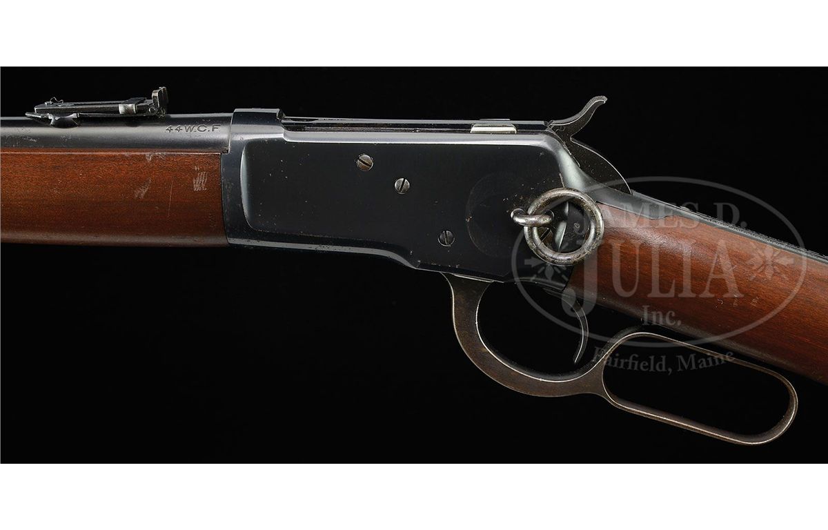 SN 817950. Cal. 44 WCF (44-40). Standard grade carbine with 20" bbl, full magazine, square base front sight and 2,000 yard carbine ladder rear sight. Left side of receiver has a staple & ring. Mounted with nicely figured, uncheckered gum wood stock & forearm with straight stock & crescent buttplate. PROVENANCE: Wes Adams Estate Collection. CONDITION: Extremely fine. Overall retains about 99% crisp, orig blue with a few scattered pin pricks of light rust and a small scratch on the receiver & a light halo from the saddle ring; lever, hammer & buttplate retain about all of their orig blue with the lever flaked to a medium to dark patina. Wood is sound with a few light surface mars and overall retains virtually all of its orig factory finish. Mechanics are crisp, brilliant shiny bore, appears to be new & unfired. 4-44671 JR59