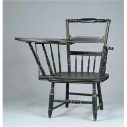 Lot # 374 FINE WRITING ARM HITCHCOCK WINDSOR. Painted black with mustard stenciling, pillow back crest with half spindle back. Scrolled left arm and large writing surface for other arm. Wide plank seat. Splayed bamboo style legs with box stretcher. SIZE: 36” h x 15” seat h. CONDITION: Very good. 9-99715 (1,000-2,000)