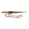 An example of superior quality with walrus grips, the tangbands and bolster forged of fine wootz steel, true-inlaid in gold with cartouches containing attributes of the Almighty. The single-edged blade with finely-chiseled spine, inlaid in gold at the forte, and forged of Persian Kara Taban (Brilliant Black) wootz steel, retaining its original lustre. In its velvet-covered wooden scabbard with superbly pierced, embossed and engraved silver mounts, together with a gold floral applique. Retains its woven silk tassels.Mid-18th century.Overall length 43 cm.