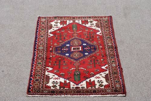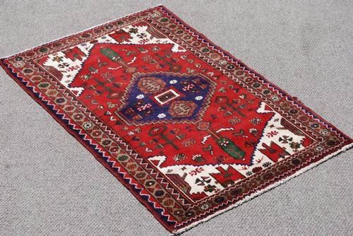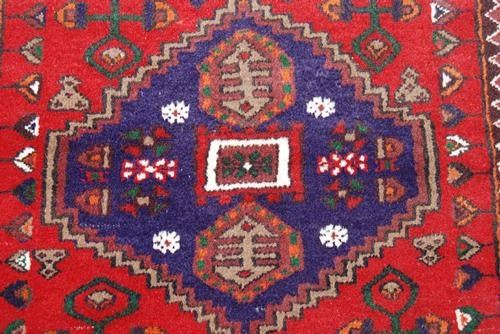 FINELY CONTRASTED HAND WOVEN PERSIAN HAMEDAN RUG. SIZE 3.5 X 5.2 FEET, MADE OF FINE QUALITY BABY LAMB'S WOOL PILE ON COTTON FOUNDATION, ALL NATURAL VEGETABLE DYE, INCORPORATING A FINELY DETAILED FLORAL PATTERN ON A RICH RED BACKGROUND WITH A LARGE CENTERPIECE MEDALLION, CROWNED CORNERS AND AN INTRICATELY DONE FLORAL BORDER. HAND WOVEN IN HAMEDAN, Iran