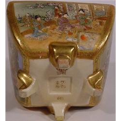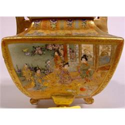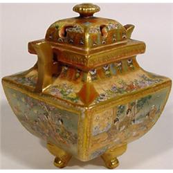 FINELY DECORATED AND GILDED SATSUMA FOOTED INCENSE JAR WITH LID, Meiji period, late 19th century, signed Takazan, of shaped square form, having a domed and pierced lid with gilded knop, the exceptional decorations depicting panels of geishas and children in landscape and garden settings; 3-3/4 inches square, 5-1/2 inch height