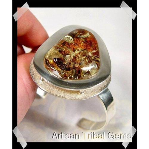 Full of magical inclusions and the artist has chosen to use a double wall of sterling to exhibit the stone to it's best advantage. The classical style is executed to perfection leaving the finest NATURAL Baltic amber stone to shine! Measurements are 46x40x16mm and for those not familiar with metric 25mm=1". Inside measurement 5.5" with a 1.1" opening. Heavy walled silver which is not adjustable. Truly a designer piece of jewelry worthy of consideration.