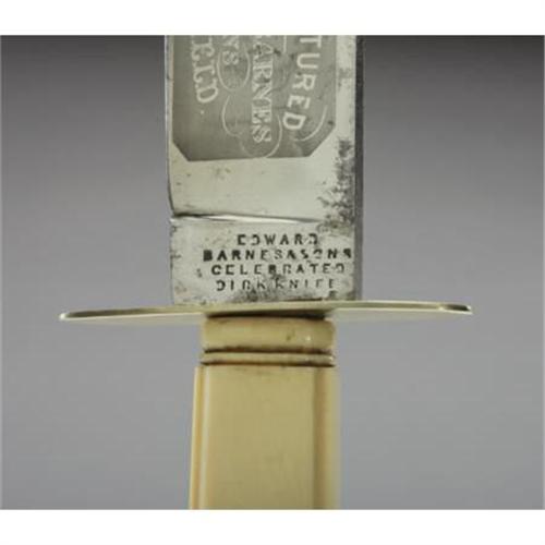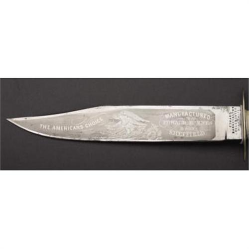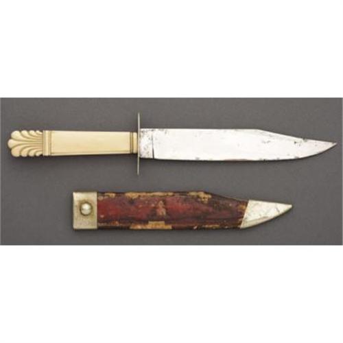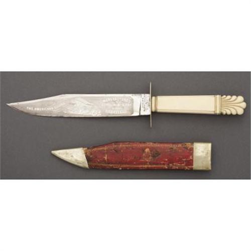 <B>FINEST-ETCHED "AMERICAN CHOICE" BOWIE KNIFE IN EXISTENCE, CIRCA 1840-50.</B></I> This beautiful Bowie knife measures 12" overall and is striking in its appearance, especially the etching on the 7" blade. Stamped at the ricasso, "Edward Barnes & Sons Celebrated Dirk Knife", the blade continues for the full 7" with elaborate etching of the company name with "Sheffield" added below at about 1" from the ricasso. The Sheffield, England manufacturers of fine knives attracted American buyers by etching the American eagle onto their blades as in this knife where the eagle is depicting standing on a Federal shield clutching arrows. At 1" from the tip the etching "America's Choice" amid a scroll appears making nearly the entire left side of the blade etched from ricasso to tip. While there are scratch marks on the right side of the blade giving evidence of use, the overall blade, especially the etching, are in remarkable condition.<BR>The 4 1/2" ivory handle has a carved scalloped shell pommel and is in excellent condition. The ivory exhibits a nice beige color from use but is still in near-pristine condition. The thin 2" oval crossguard finishes the knife in a beautiful fashion making this a prized Bowie, well-etched with a wonderful ivory handle.<BR>A red Moroccan leather sheath stamped with a gold border accompanies the Bowie and is embossed with a portrait of General Zachary Taylor on both sides. The sheath has a 3/4" brass throat with frog and a 1 1/2" brass tip. The finest etched blade in existence made during the Mexican War.<I> From The William Turner Collection.</B></I><BR><BR><b>Shipping:</b> Bats, Clubs, Sticks, Swords, Rif (<a target="_blank" href="http://www.heritageauctions.com/common/shipping.php">view shipping information</a>)