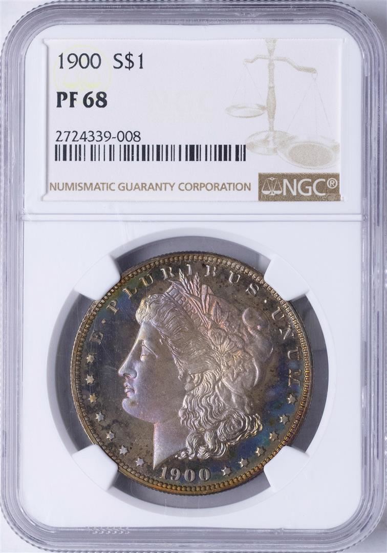 One 1900 $1 Morgan Silver Dollar Proof Coin NGC graded PF68 Amazing Toning. A mintage of only 912 proof Morgan dollars and none graded numerically higher than this amazing example. NGC Certified.