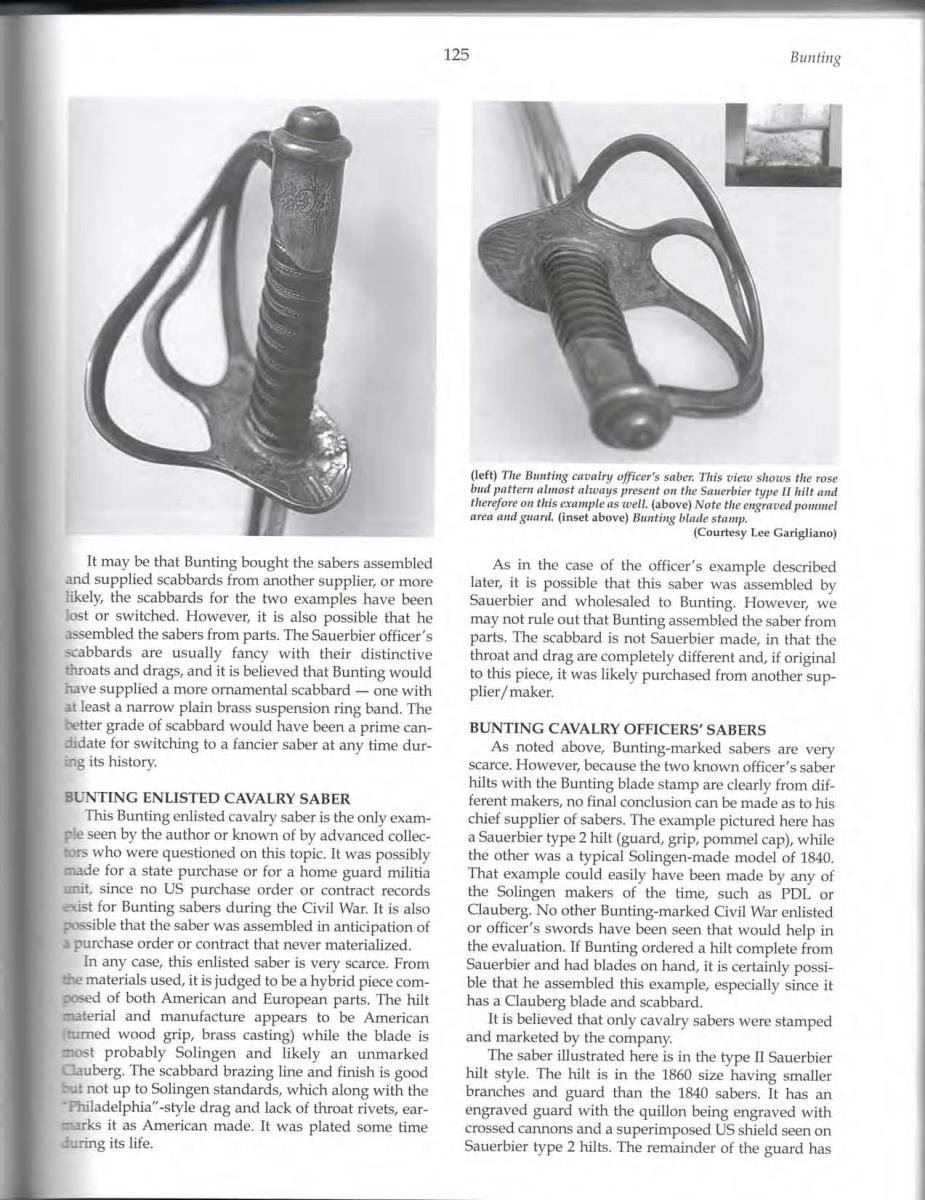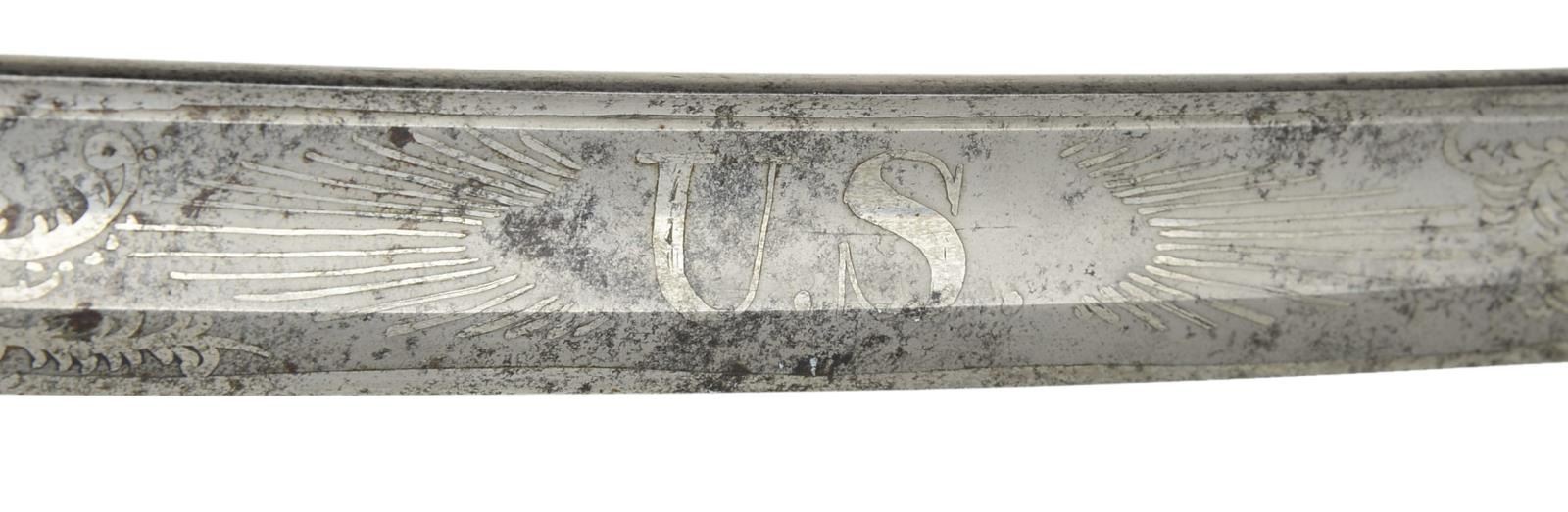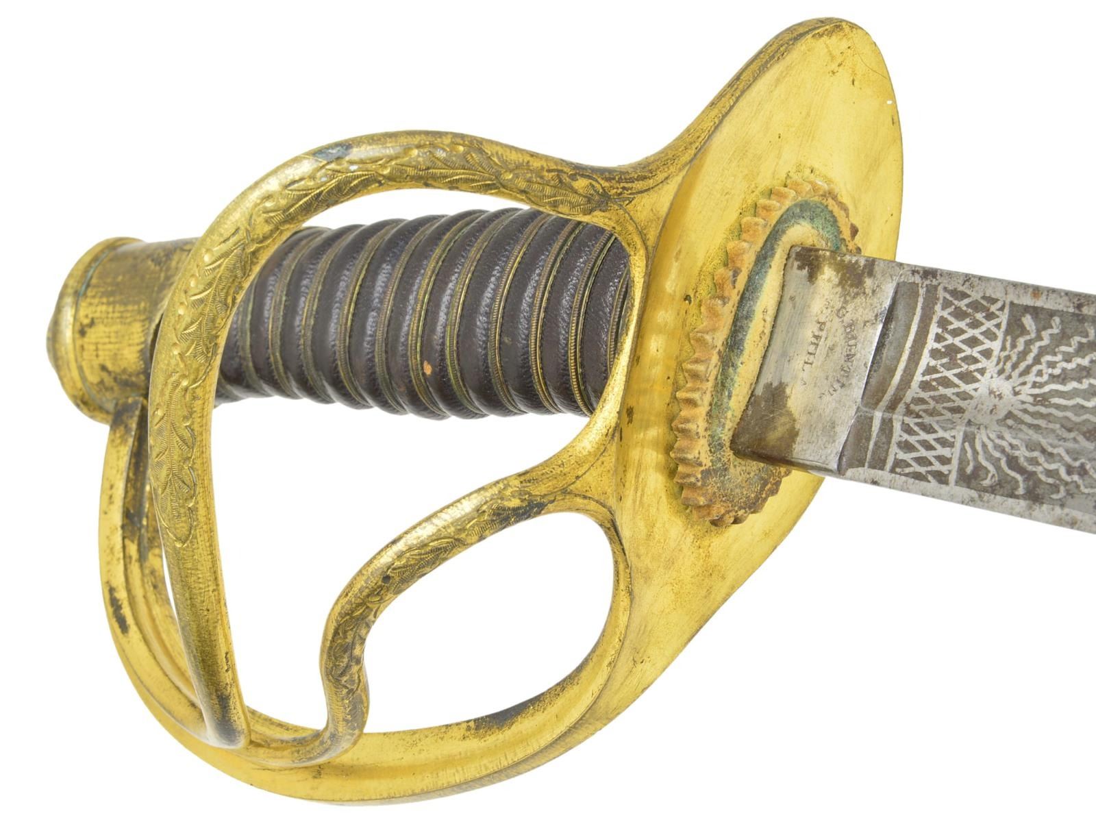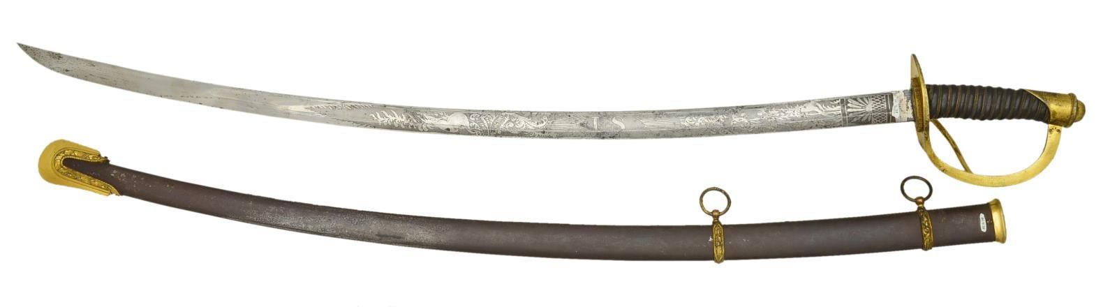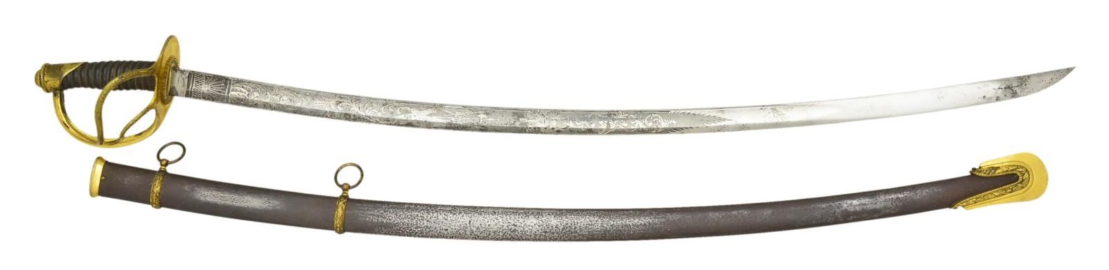 CIVIL WAR CAVALRY OFFICER SABER. 35" Blade, etched in 21" panels w/ patriotic American motifs including motto: “UNION AND VICTORY”. Ricasso is stamped on both sides “S.C. BUNTING JR.” in arch above “PHILA”. Samuel Bunting Jr. advertises in 1862 as a sword mfg. though according to Don Thillman’s excellent text on cavalry & artillery sabers. Bunting only assembled or retailed swords. A majority of Bunting swords are enlisted & only 2 cavalry officers were known, both pictured & described in Thillman’s text. This example makes the 3rd & is in excellent condition, exhibiting unique engraved hilt w/ a cannon filling edge of guard. Scabbard is brass mounted w/ relief cast oak leaf design on sword rings & drag. CONDITION: fine overall, blade retains much of its original polish & luster w/ staining. Brown leather grip retains most of its original polish w/ few sm. scuffs, tripled brass wire wrap still retains much of its original gilding. Protective leather washer has pinked edge. Scabbard body has iron patina w/ pitting. Scabbard mounts retain most of their original gilding. (02-14894/JS). $4,500-6,500.