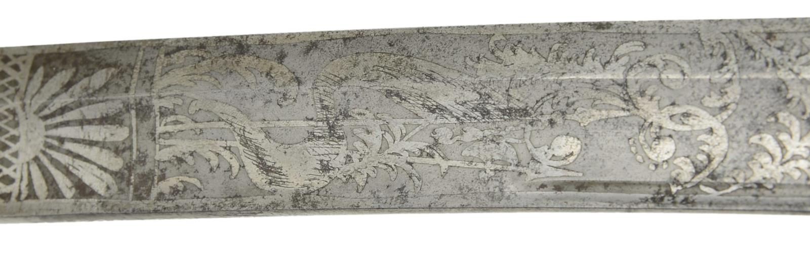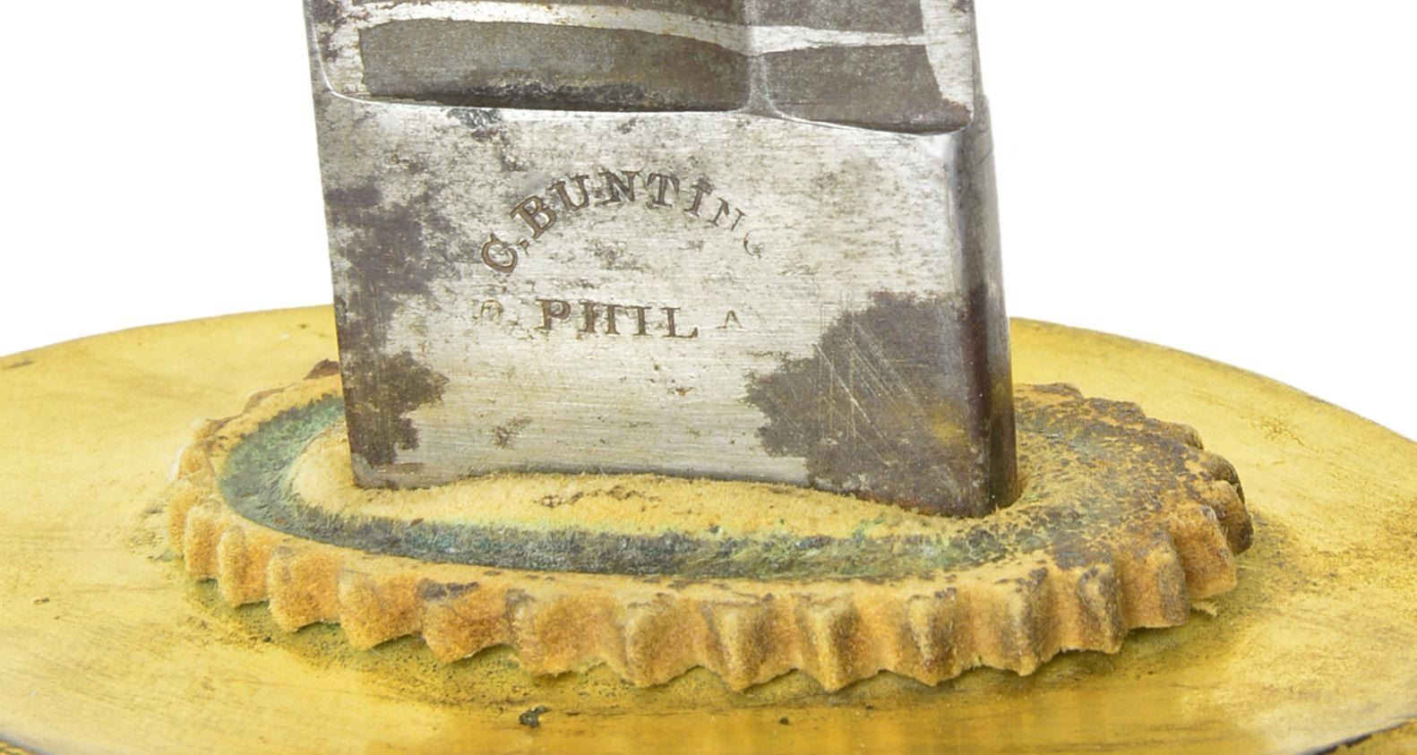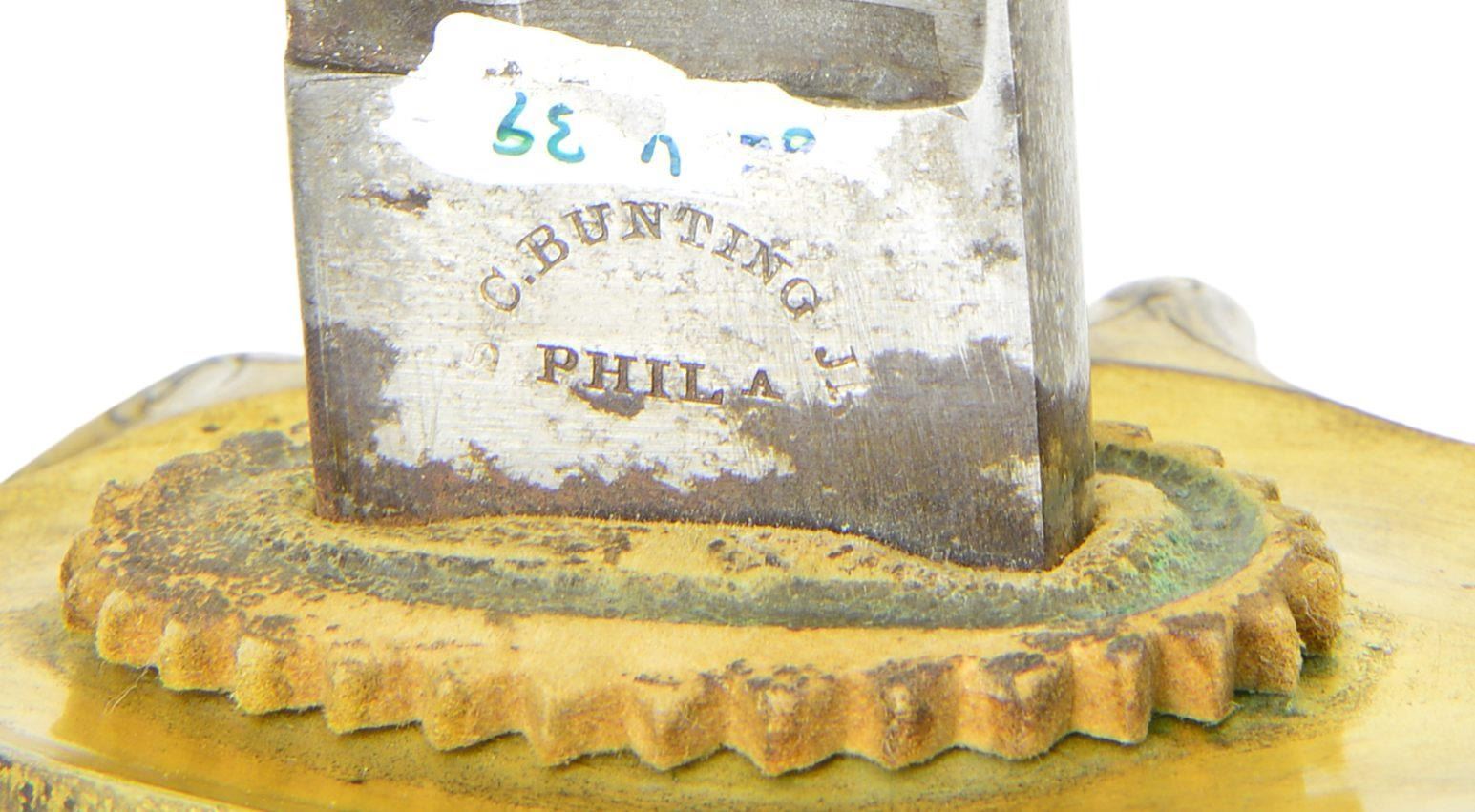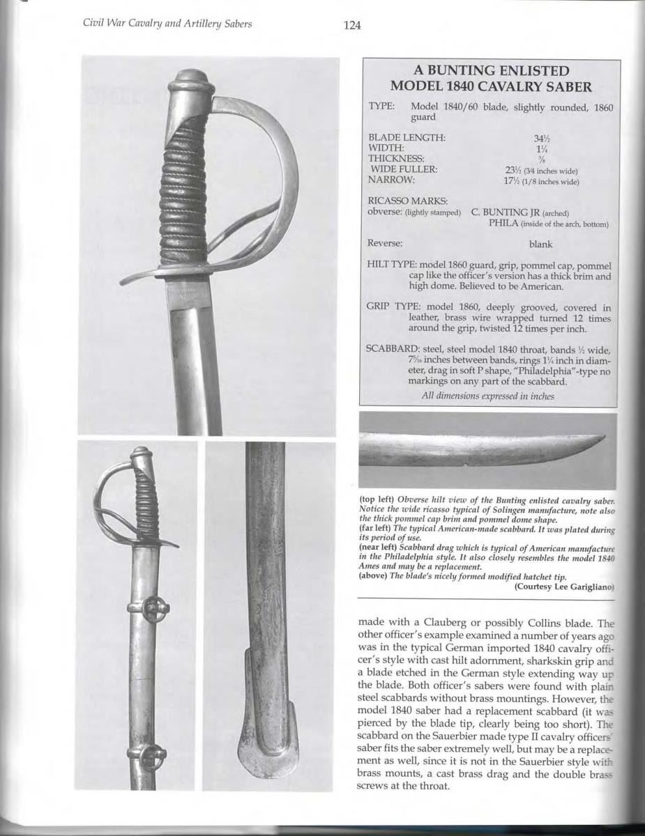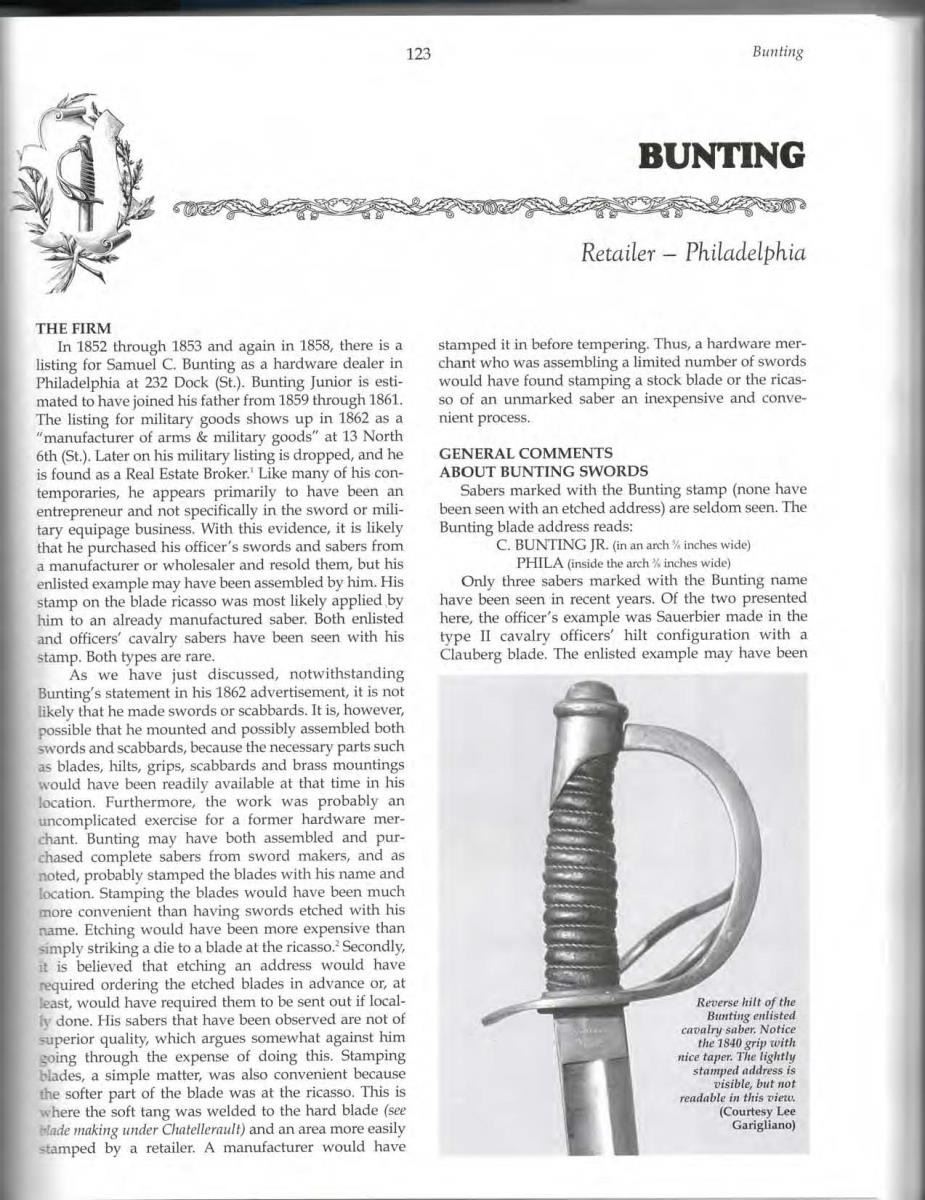 CIVIL WAR CAVALRY OFFICER SABER. 35" Blade, etched in 21" panels w/ patriotic American motifs including motto: “UNION AND VICTORY”. Ricasso is stamped on both sides “S.C. BUNTING JR.” in arch above “PHILA”. Samuel Bunting Jr. advertises in 1862 as a sword mfg. though according to Don Thillman’s excellent text on cavalry & artillery sabers. Bunting only assembled or retailed swords. A majority of Bunting swords are enlisted & only 2 cavalry officers were known, both pictured & described in Thillman’s text. This example makes the 3rd & is in excellent condition, exhibiting unique engraved hilt w/ a cannon filling edge of guard. Scabbard is brass mounted w/ relief cast oak leaf design on sword rings & drag. CONDITION: fine overall, blade retains much of its original polish & luster w/ staining. Brown leather grip retains most of its original polish w/ few sm. scuffs, tripled brass wire wrap still retains much of its original gilding. Protective leather washer has pinked edge. Scabbard body has iron patina w/ pitting. Scabbard mounts retain most of their original gilding. (02-14894/JS). $4,500-6,500.