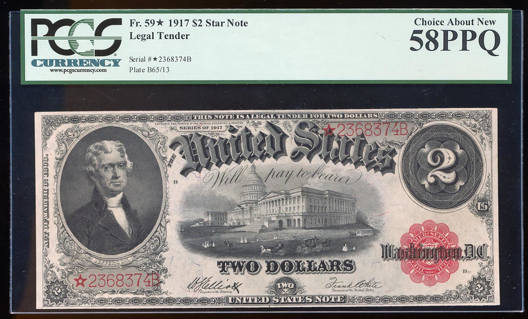 One FINEST KNOWN STAR 1917 $2 Legal Tender Note Fr.59* PCGS Choice About New 58PPQ. PCGS Graded.