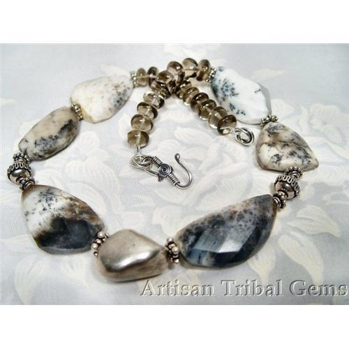 FINEST of Faceted DANDRITE OPAL Choker.... An awesome choker of the finest natural DANDRITE opal accented with a remarkable selection of hilltribe silver and finished to perfection with high quality translucent smoky topaz. With a gram weight of 118 this choker is sure to be noticed and would be the perfect accessory for any occasion! The center silver bead measures 27x21mm for perspective to size. For those not familiar with metric 25mm=1". The choker has a length of 18". Destined to quickly become your favorite piece of jewelry this necklace comes with our highest recommendations. (d509)