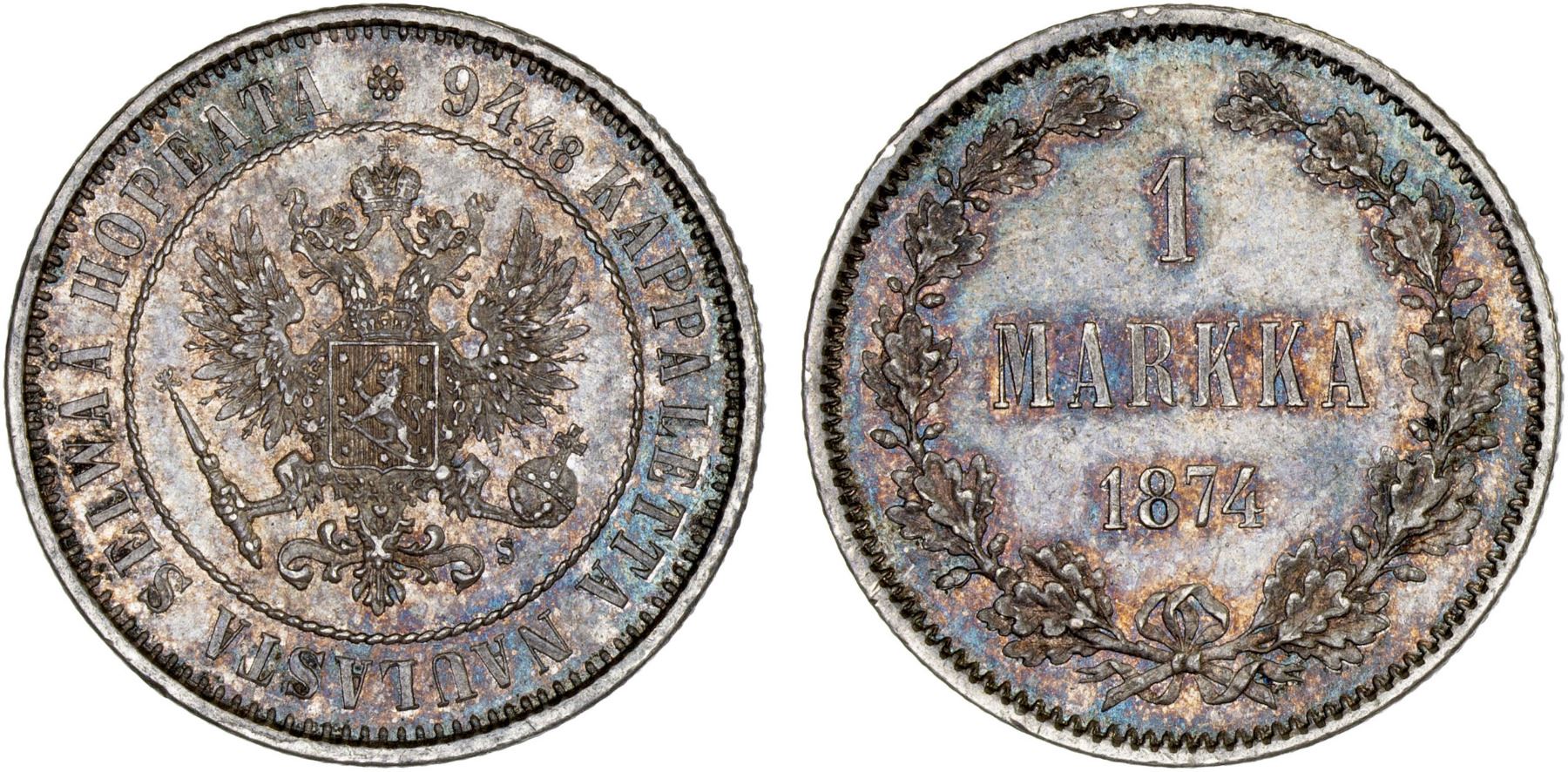 FINLAND: Alexander II, 1855-1881, AR markka, 1874, KM-3.2, initial S, beautiful mulicolored tone, XF-AU.