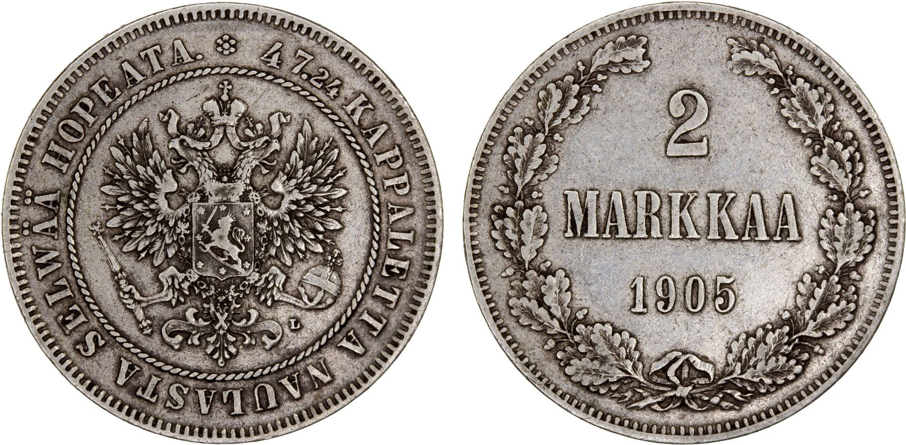 FINLAND: Nicholas II, 1894-1917, AR 2 markkaa, 1905, F-VF