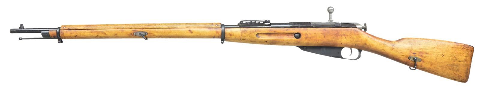 Cal 7.62x54R. S # 40101. Bbl. 31 ½” import marked on right side. Bolt knob is matching, other S #s mismatched. Bbl. top marked with an “SA” army marking, boxed “VKT” logo, “B” Belgian barrel marking and 1942 date. Straight bolt handle. Hex receiver with importer added S # on left side. Ladder rear sight graduated to 3200 Arshins. Inverted V front sight. Cleaning rod is present. Hardwood stock with finger joint splice. Finnish sling slots with wire swivels. UNATTACHED ACCESSORIES: 17 1/2'” M91 socket bayonet. Bayonet has serial number “95870” and appears to be post-WW2 Balkan issue. Bayonet shows silvering, freckling and some dings. CONDITION: sanded hardwood stock shows some handling marks and dings. Front of handguard has a small crack. Metal retains 80% arsenal reworked blue with buttplate being a silver-gray patina with scattered light pitting. Front of barrel shows light dings, receiver shows some light pitting and overall rifle shows some edge wear and fading. Very good shiny bore. (22-2344/MJC). CURIO. $100-200.
