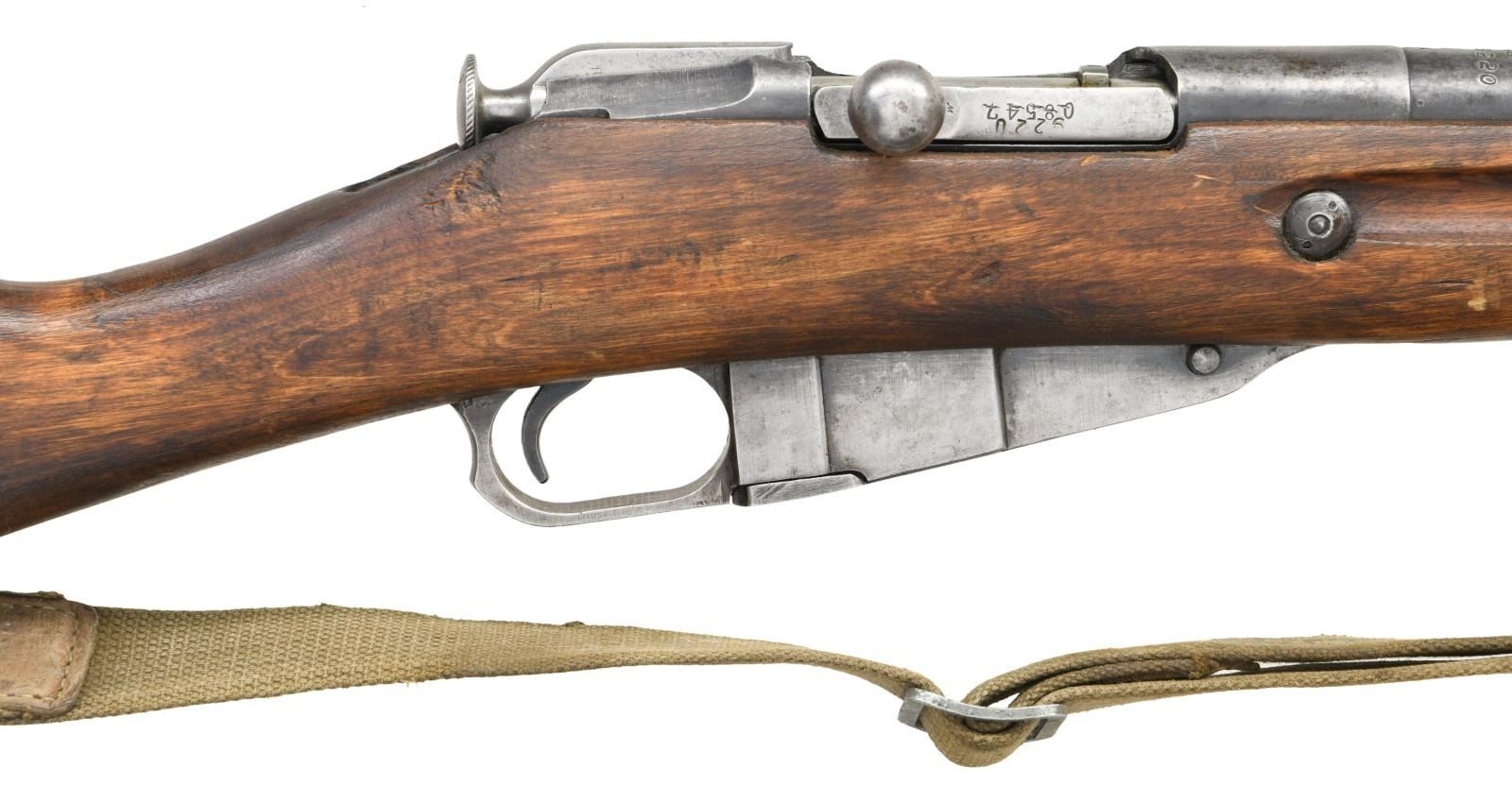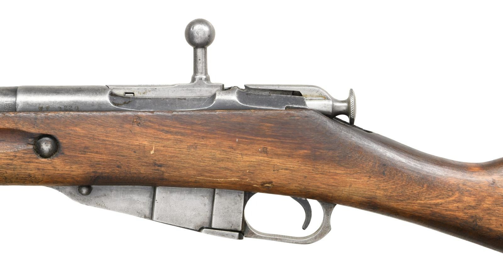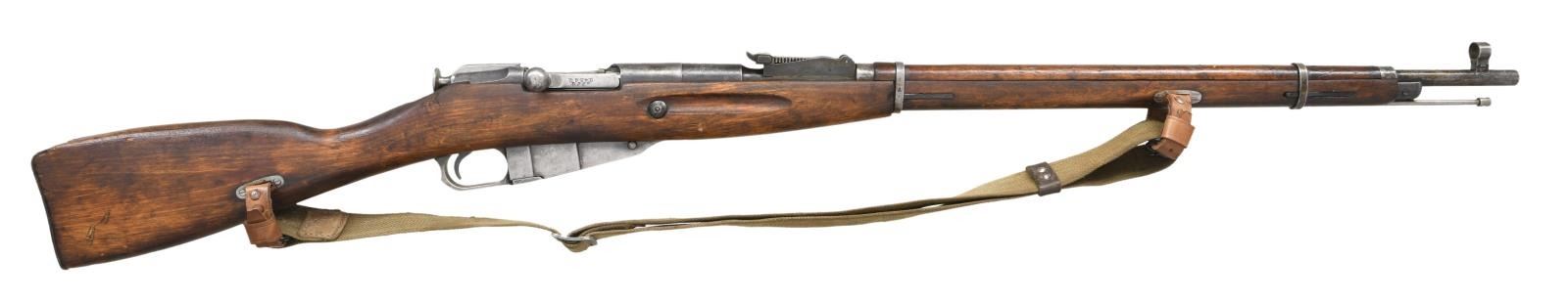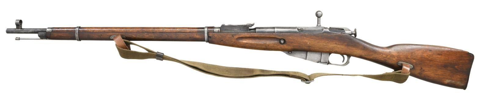 Cal. 7.62x54R. S# VT9220. Bbl. 29" w/ import marking. All matching numbers w/ bolt being Finn arsenal renumbered to match. Top of bbl. has Izhevsk markings w/ 1940 date, serial number & Finnish "D" marking for D166 bullet. Left side of bbl. has boxed Finnish "SA" army marking. Left side of receiver has importer added serial number. Tangent rear sight graduated to 2000m. Post front sight w/ hood. European hardwood stock set w/ screw in sling slots & canvas sling. Right side of stock has faint Tula star marking. CONDITION: arsenal refinished stock set w/ scattered dings & handling marks. Metal is fading to gray w/ scattered traces of arsenal blue & some oxidation staining. Good bore w/ counterbore at muzzle & scattered light pitting. (23-1964/MJC). CURIO. $100-300.