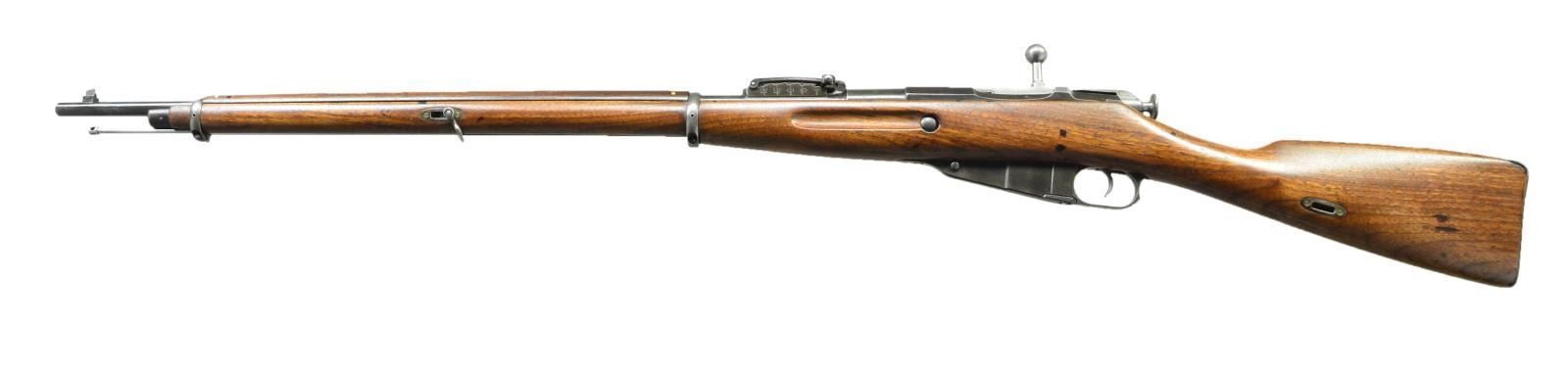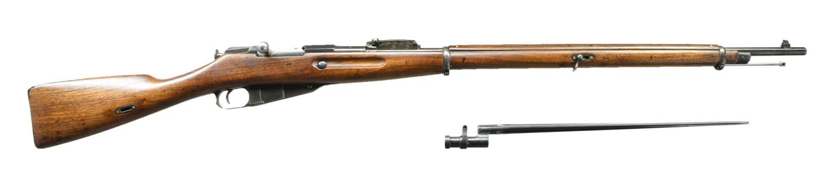 Cal. 7.62x54R. S # 224159. Bbl. 31 1/2" w/ import marking. Matching bolt, other parts are unnumbered. Bbl. top is marked w/ Czarist eagle, "REMINGTON ARMORY 1917" and S #. Left side of bbl. has Finnish army "S.A." property stamp. Straight bolt handle. Rear sight graduated to 3200 Arshins w/ Finnish renumbering on sight base. Inverted V front sight. Cleaning rod present. Walnut stock set w/ faint Imperial Russian cartouche on right side and "R" stamp behind rear of triggerguard. UNATTACHED ACCESORIES: 1891 Mosin Socket bayonet. Bayonet is numbered "88739" & marked w/ a star on the left side. Bayonet retains nearly all its arsenal blue finish w/ light silvering & freckling. CONDITION: refinished walnut stock set has added finish, notable triangular repair ahead of the magazine, a few smaller armorer rectangular repairs & scattered handling marks. Metal is drifting towards a gray patina w/ some light pitting on bottom metal & some silvering on bbl. near muzzle. Fair bore showing scattered frosting & light pitting. (22-2487/MJC). CURIO. $300-400.