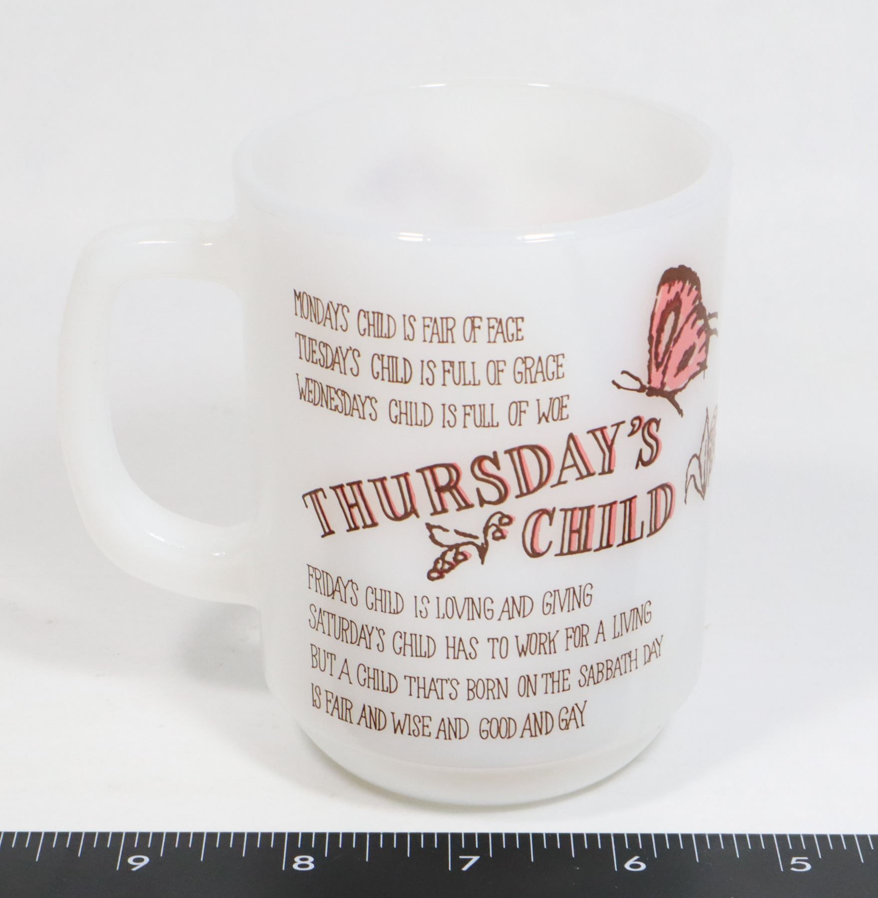 FIRE KING THURSDAY'S CHILD MILK GLASS COFFEE MUG