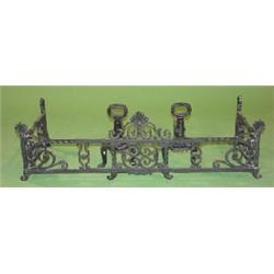 3 PIECE WROUGH IRON FIREPLACE SET. Arts & Crafts style. Consists of fender & two and irons. Overpainted with black paint. Fender: 11” H, 36.5” L. And Irons: 11” H