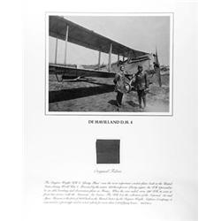 A fine relic a 2" x 2" inch section of fabric from what has been called the most important combat plane built in the United States during the First World War. Built by the Dayton Wright Airplane Company, the DH 4 proved to be a useful bombing and observation plane over France. By 1919 there were some 196 DH 4's in front line service. The relic is affixed to a poster-sized sheet picturing the DH 4 on the ground with two pilots standing in front, with a printed description at bottom. Fine condition. Perfect for display!