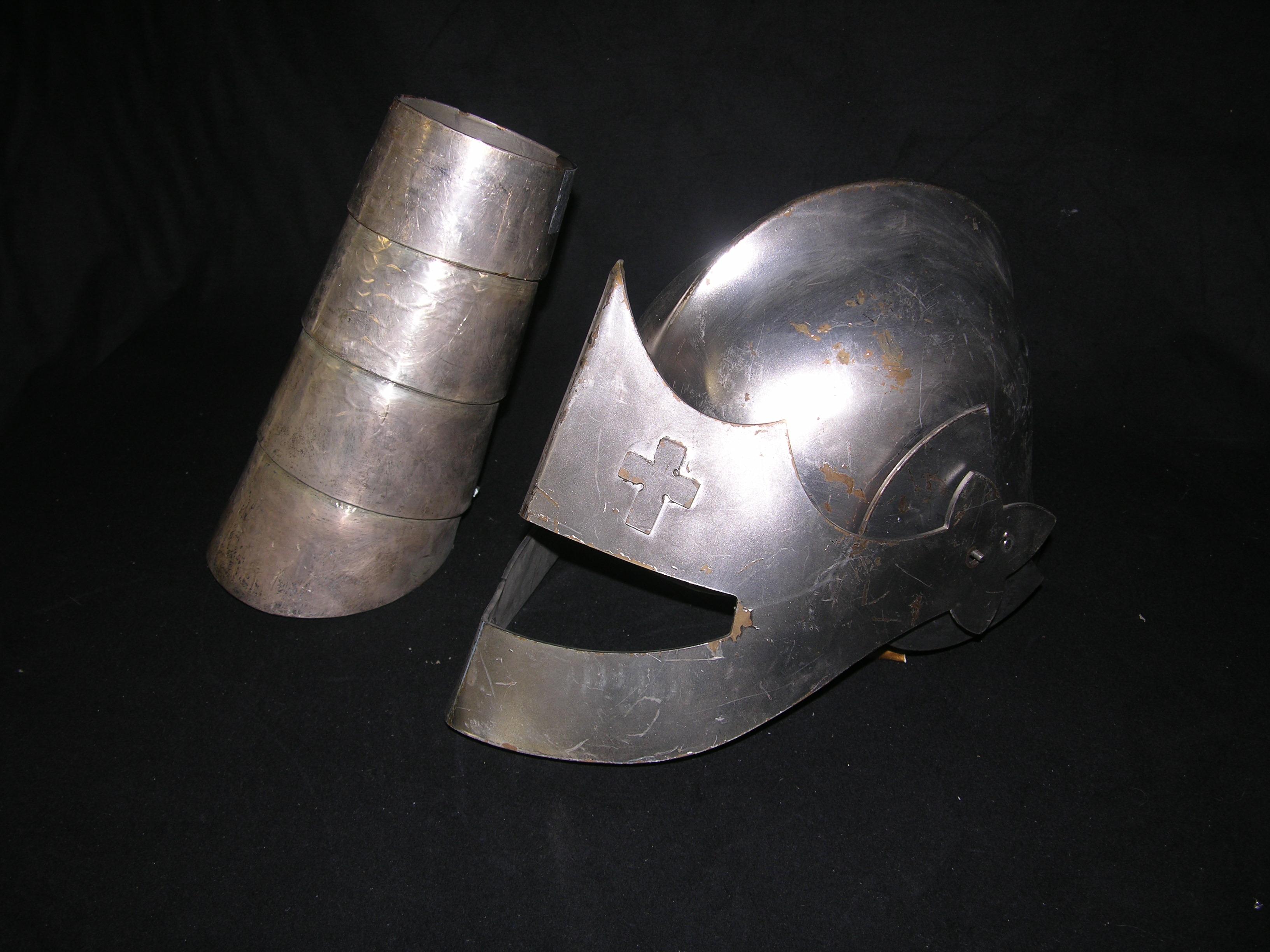 First Knight (1995) - Metal Helmet Face Shield and Arm Guard. These were used for design and/or molds for the plastic screen worn copies. Also included are plastic versions and a full helmet. Plastic helmet and face plate have minor cracks. This item is oversized and will require additional shipping charges. Please email for shipping rates prior to bidding.