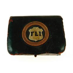 “FIRST LIGHT INFANTRY” CARTRIDGE BOX. The 2-flap leather pouch contains 2 tin cartridge holders, a German silver shield on the outer flap has an enameled "F.L.I." marking and is surrounded by a gilt brass ring 3-7/8" in diameter. CONDITION: Fair, the inner flap is good but the back panel and both flaps are unsewn. The front flap is chipped and worn on the edges and cracked on the surfaces. One belt loop is missing entirely and the other one is present but fastened only to a fragment of the outer lining. 4-52097 FS363