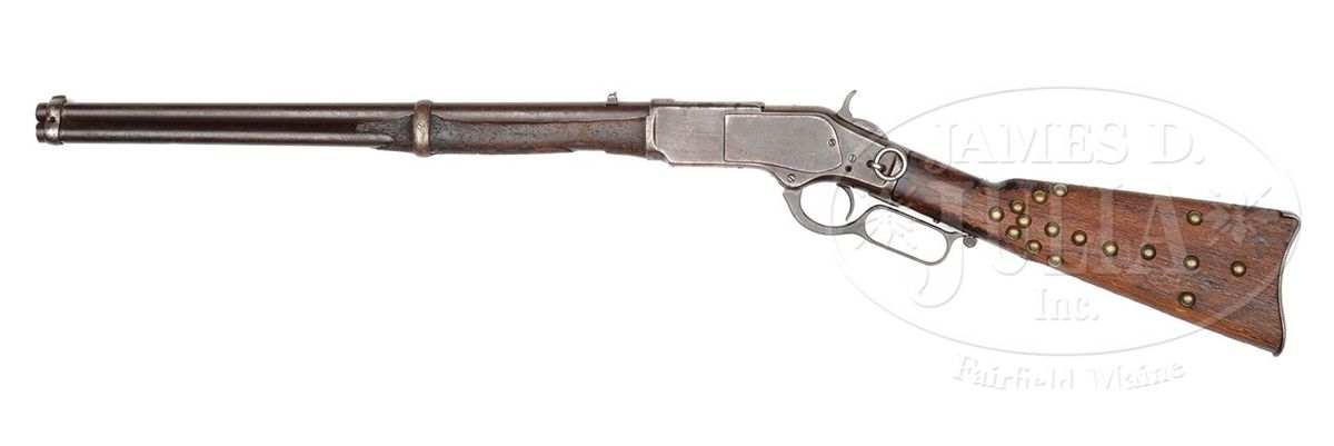 SN 13880. Cal. .44WCF. 20" rnd bbl, full mag, front sight integral with bbl band, one leaf rear sight with retaining spring and top retaining screw. Top of bbl is marked "WINCHESTER'S -REPEATING-ARMS. NEW HAVEN. CT./KING'S-IMPROVEMENT-PATENT-MARCH 29. 1866. OCTOBER 16. 1860". Later First Model receiver, mortised dustcover with checkered thumbprint, staple and ring on left side, mounted with straight grain walnut, uncheckered straight grip, steel carbine buttplate with trapdoor housing two polished pebbles of unknown origin. Gun was not disassembled for other markings but appears orig as presented showing hard use as most first model Winchester carbines of this pattern. CONDITION: Good overall. Metal is gray/brown overall with pitting. Gun is very worn. Appears mostly orig with a braised added 1" piece of metal on bottom of trigger guard where broken and added swing swivel and ring. Stocks are highly weathered and worn with about 1/2 of the forestock "weathered" away exposing magazine tube in areas. Buttstock also is missing 90% of its orig surface and tacked studs appear applied after this erosion. Mechanically gun functions partially and thumb print dustcover will not fully lock when opened and come off. Bore still shows discernible rifling with much rust and pitting. 4-49393 JS210