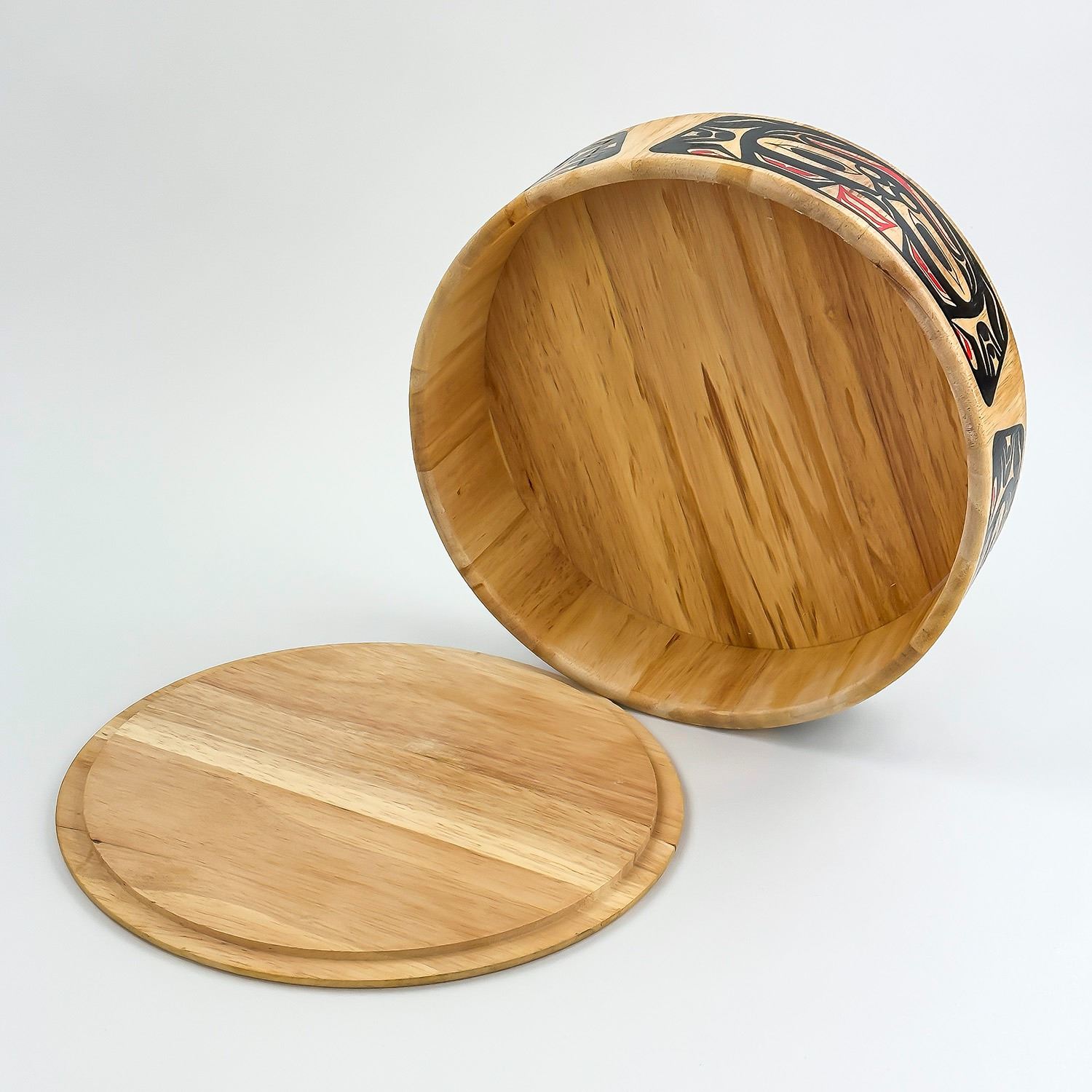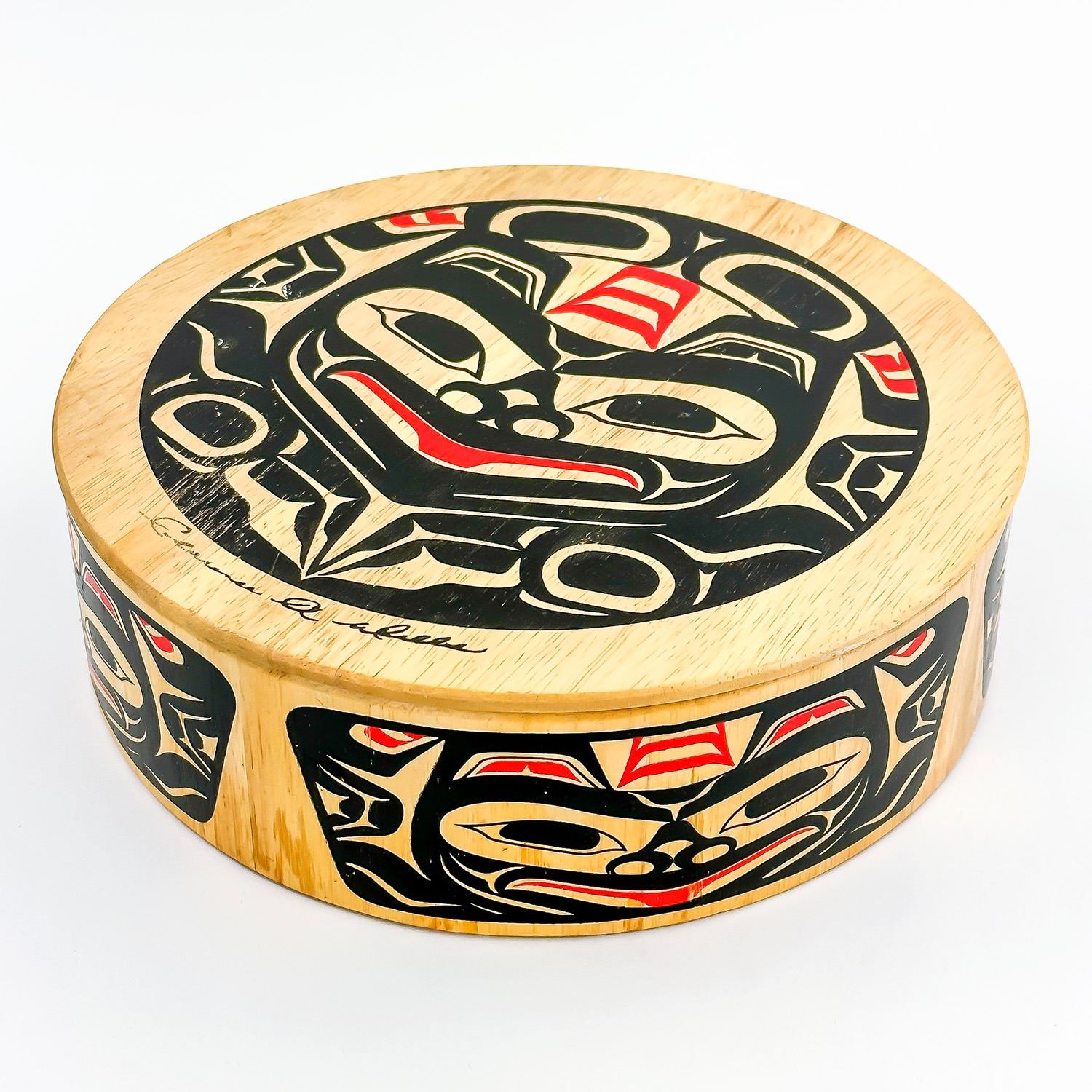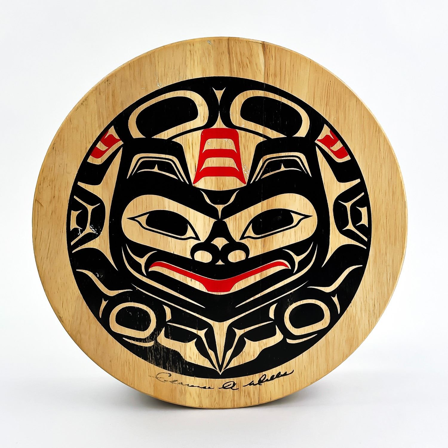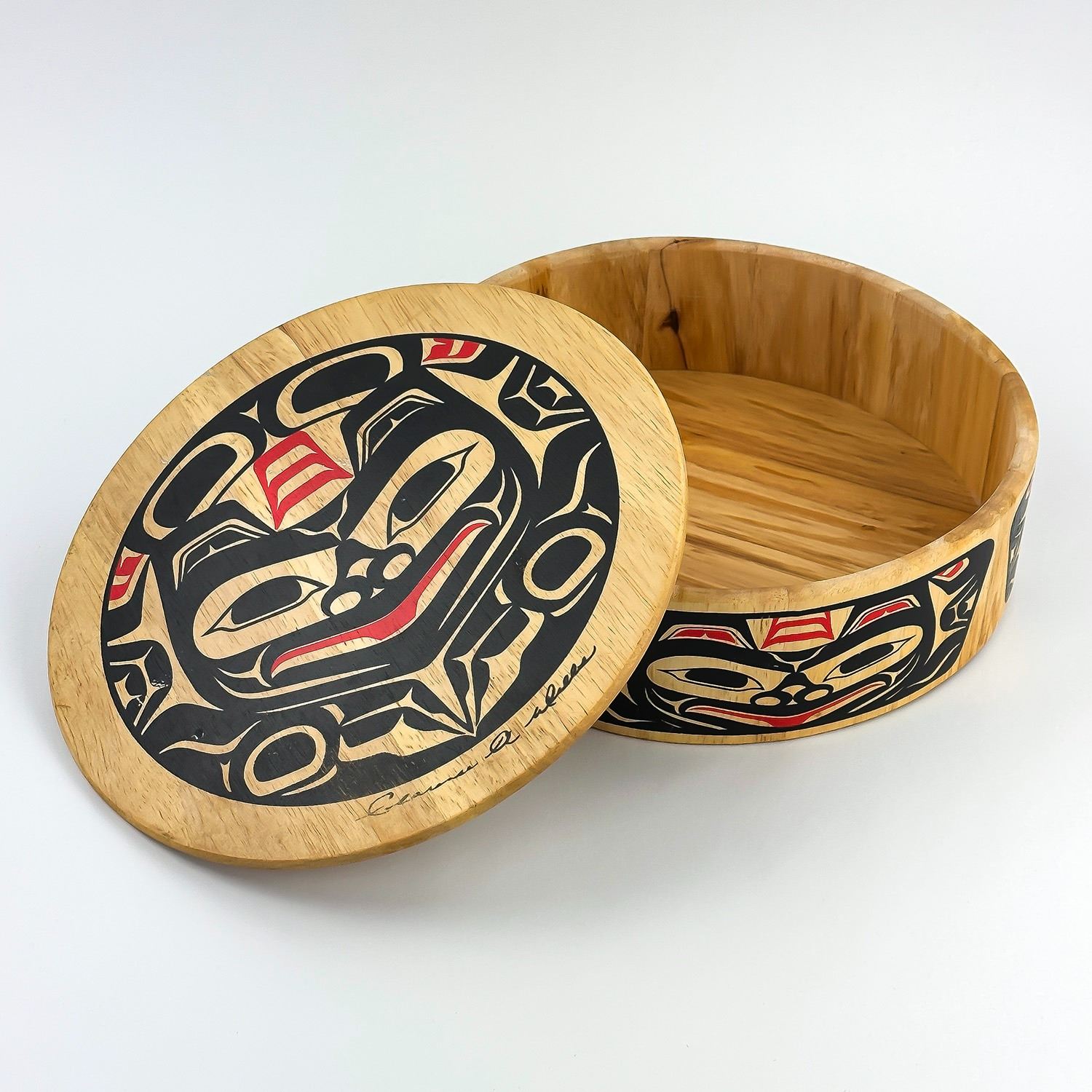 #8013 - CANADIAN NORTHWEST COAST (BRITISH COLUMBIA, CANADA) FIRST NATIONS HAIDA ARTIST CLARENCE A. WELLS - ROUND LIDDED WOODEN BOX SCULPTURE - BEAR DESIGN. MEASURES: 9.75” (24.75 CM) DIAMETER AND 3” 7.5 CM) HIGH