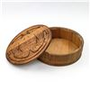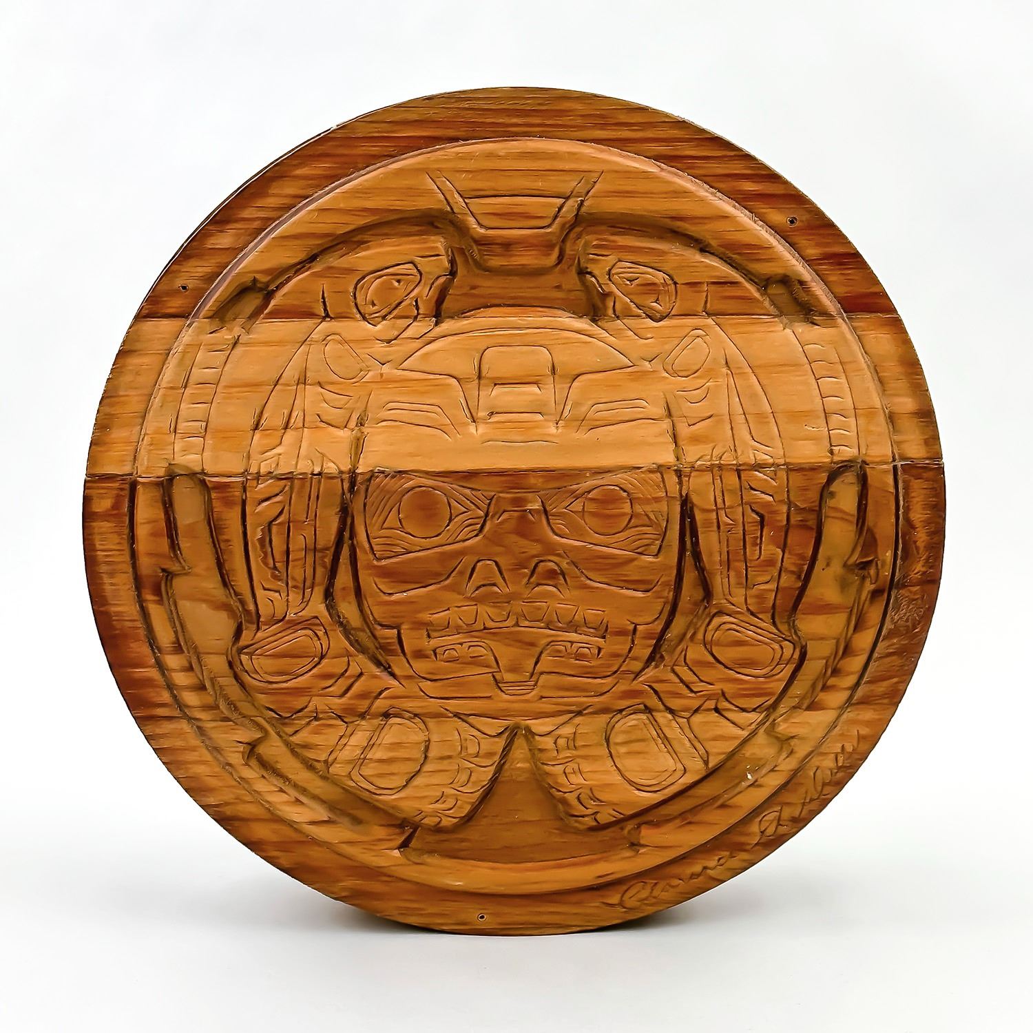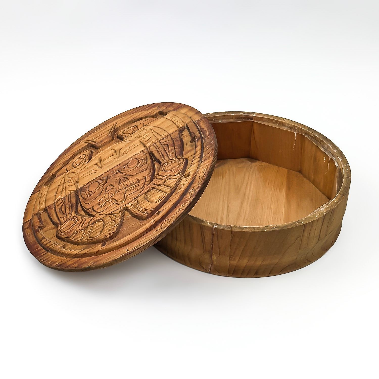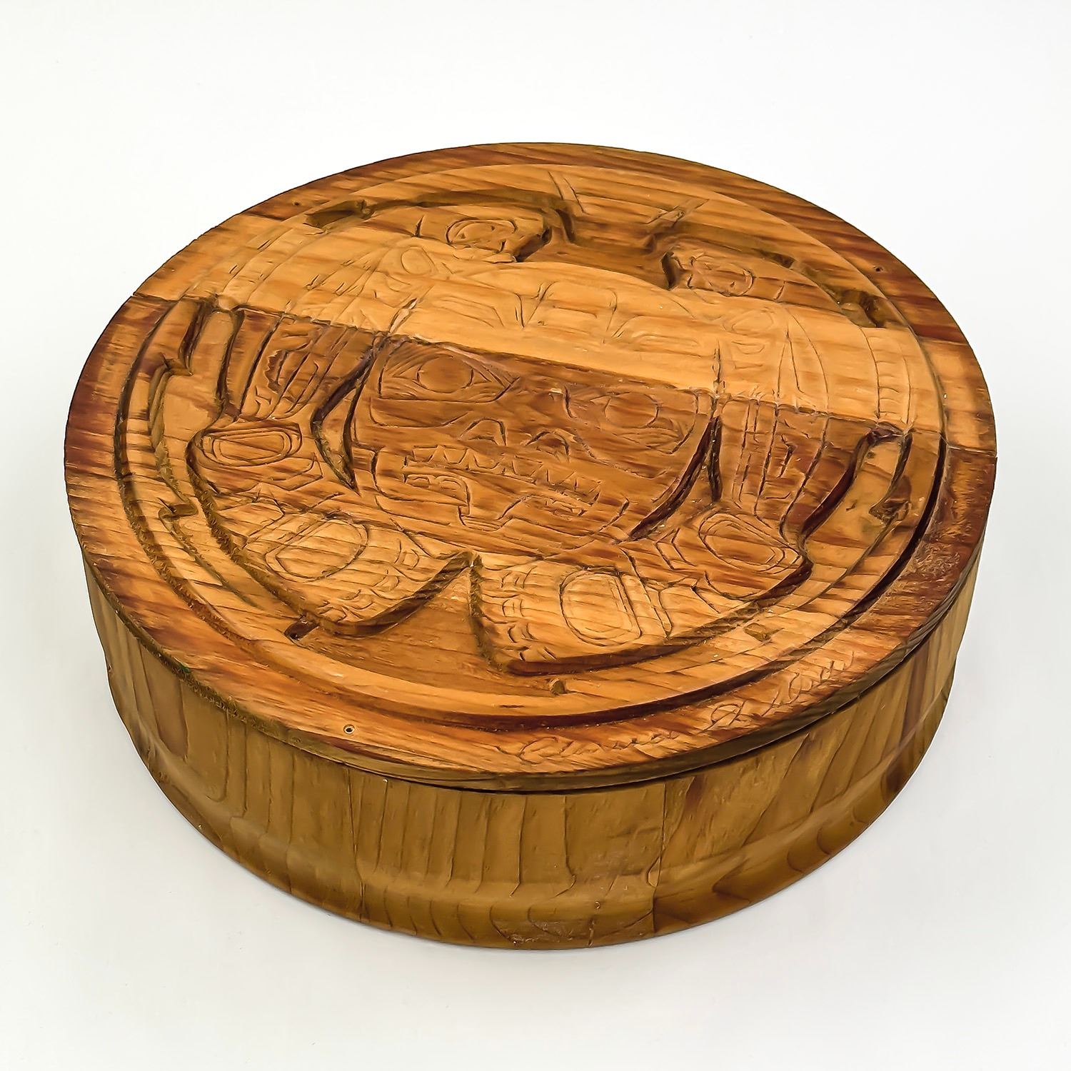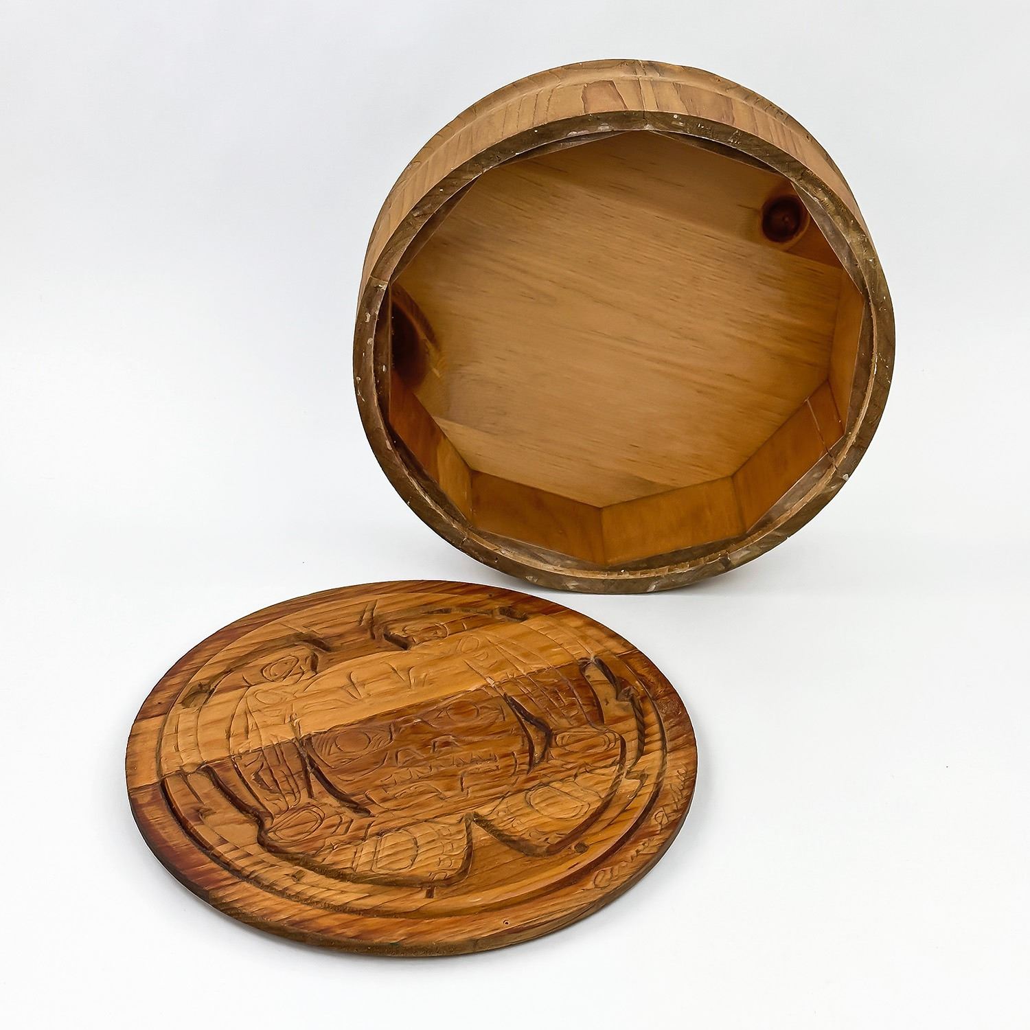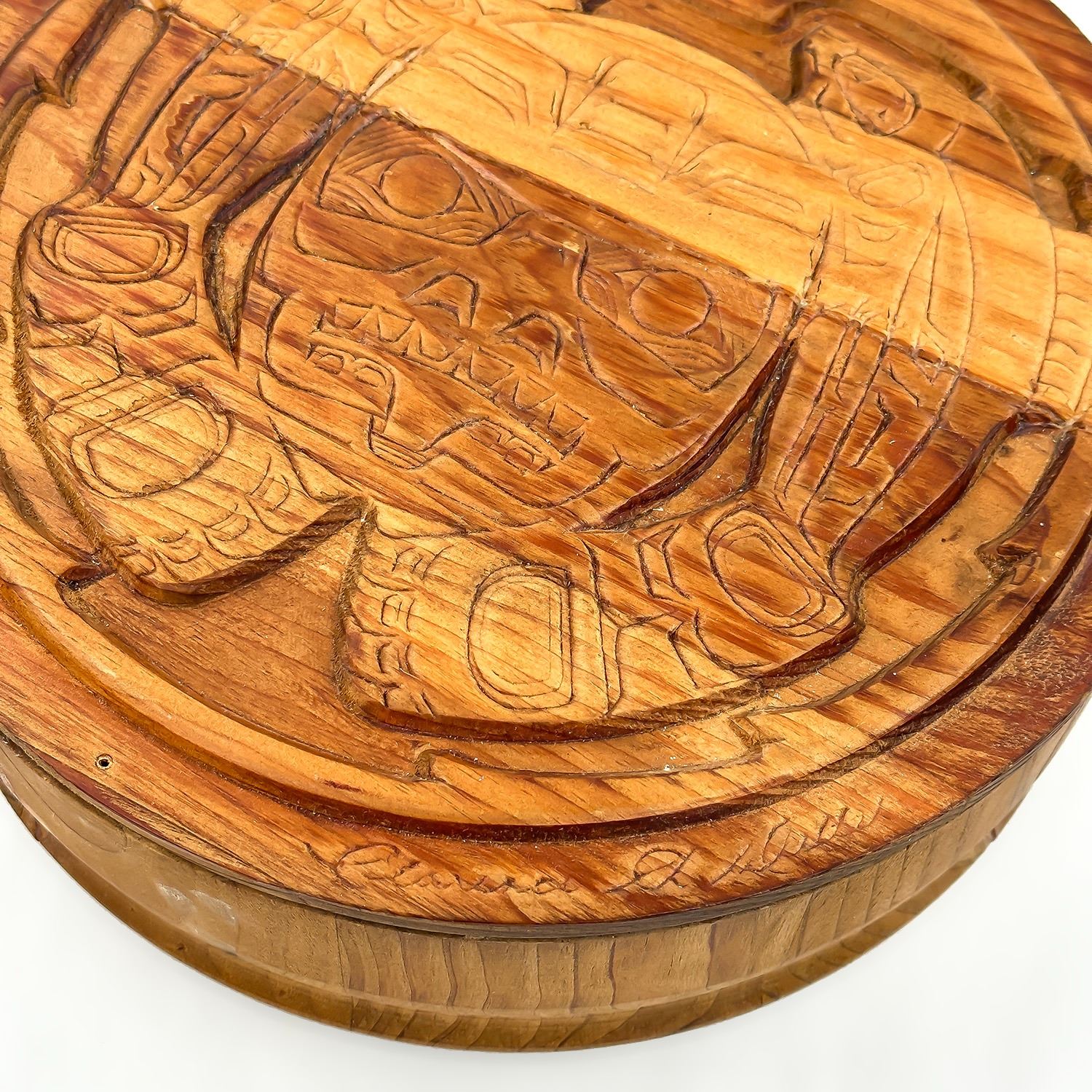 #8004 - CANADIAN NORTHWEST COAST (BRITISH COLUMBIA, CANADA) FIRST NATIONS HAIDA ARTIST CLARENCE A. WELLS - ROUND LIDDED WOODEN BOX SCULPTURE - BEAR & SALMON DESIGN. MEASURES: 10.25” (26 CM) DIAMETER AND 3” (8 CM) HIGH***ITEM(S) LOCATED IN LETHBRIDGE ALBERTA. FREE TRANSPORT TO EDMONTON OFFICE AVAILABLE FOR THIS AUCTION. WORLDWIDE SHIPPING IS AVAILABLE FOR ALL ITEMS