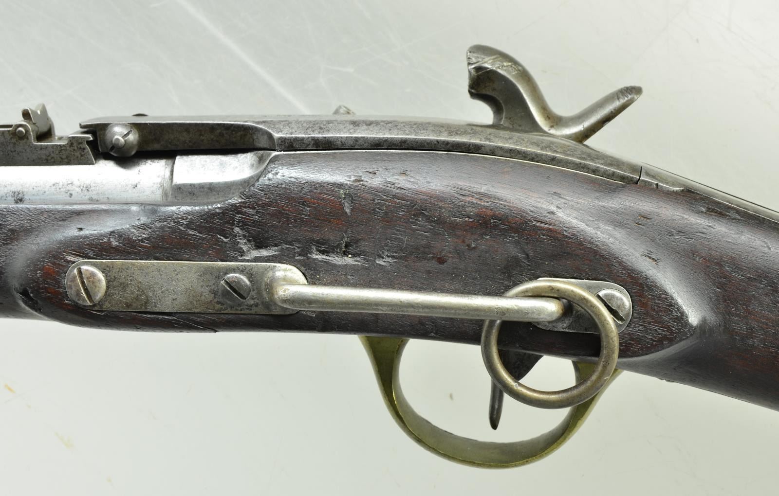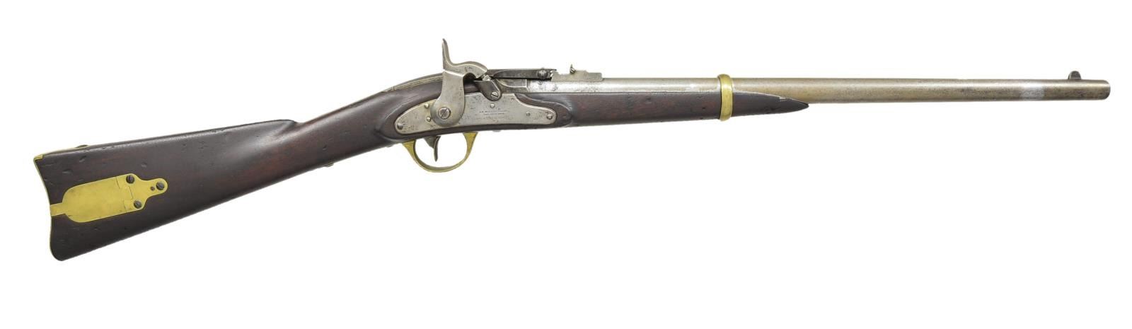 Cal. 54. S# 9100. Bbl. 22" rnd. is fitted w/ usual flip up carbine sight. Breech is opened by a monkey tail system w/ latch which engages the rear of sight base. Top of the lever is marked w/ Merrill name, address & patent date. S# is on the base of the lever & rear of the lock plate. First type lock has Merrill name & patent dates on plate & does not have an eagle stamp. Walnut stock is brass mounted except for the saddle ring on the left side which is iron. Brass patchbox is on the right side. CONDITION: fair to good, metal parts cleaned to silver gray patina. Wood w/ heavy refinish, sharp edges rounded & w/ many dings & marks. Inspectors mark obscured. Bore is very good. Shiny w/ some light scattered pitting. Lock is good. (01-20093/MGM). ANTIQUE. $1,500-2,500.