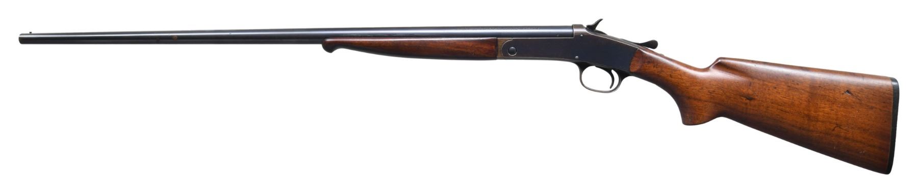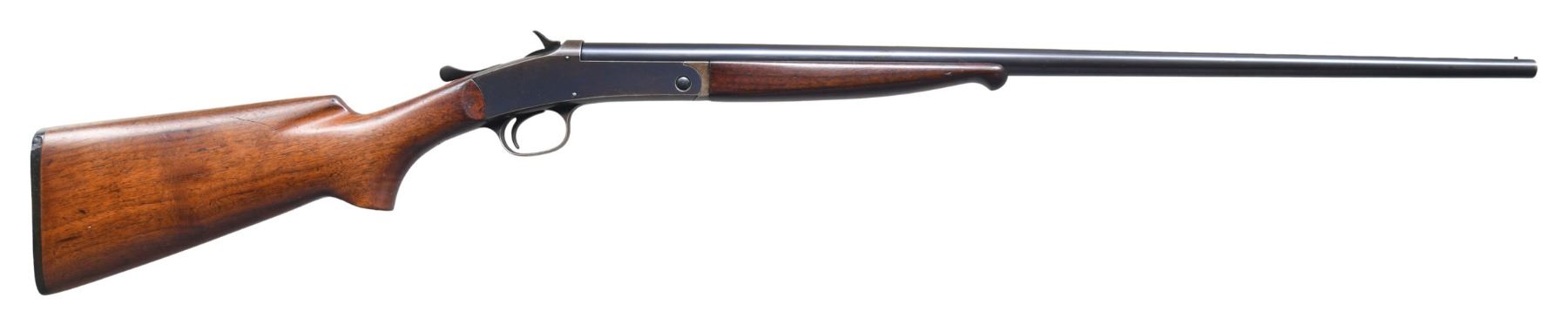 SINGLE SHOT SHOTGUN. Cal. 410 GA, 2 1/2". S# 448. Bbl. 20" plain with fixed Full choke and brass bead. Exposed hammer top lever action. Blue finish. Schnabel tip walnut forearm and pistol grip stock with original buttplate. Mfg. in 1919, first year of production. CONDITION: over 70% lightly faded blue showing carry and edge wear. Wood has worn finish showing numerous scratches and marks. Sound mechanics. Good bright bore. PROVENANCE: Estate of Russell Dickerman. (25-1898/DS). CURIO. $300-500.