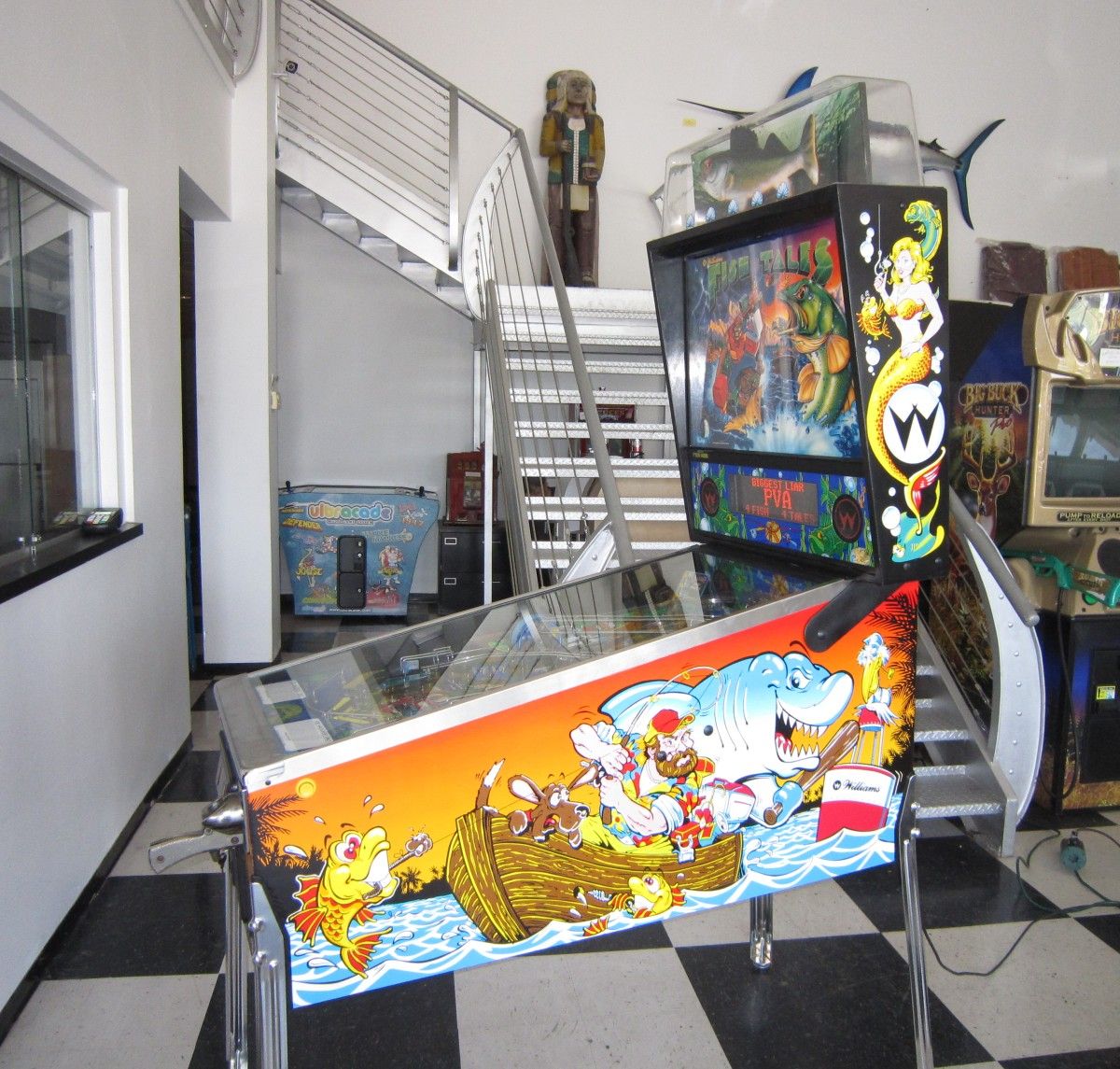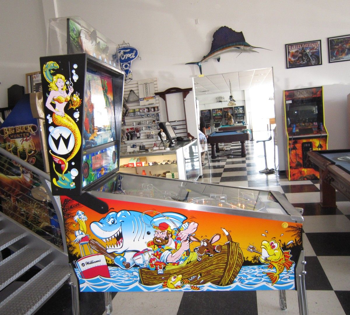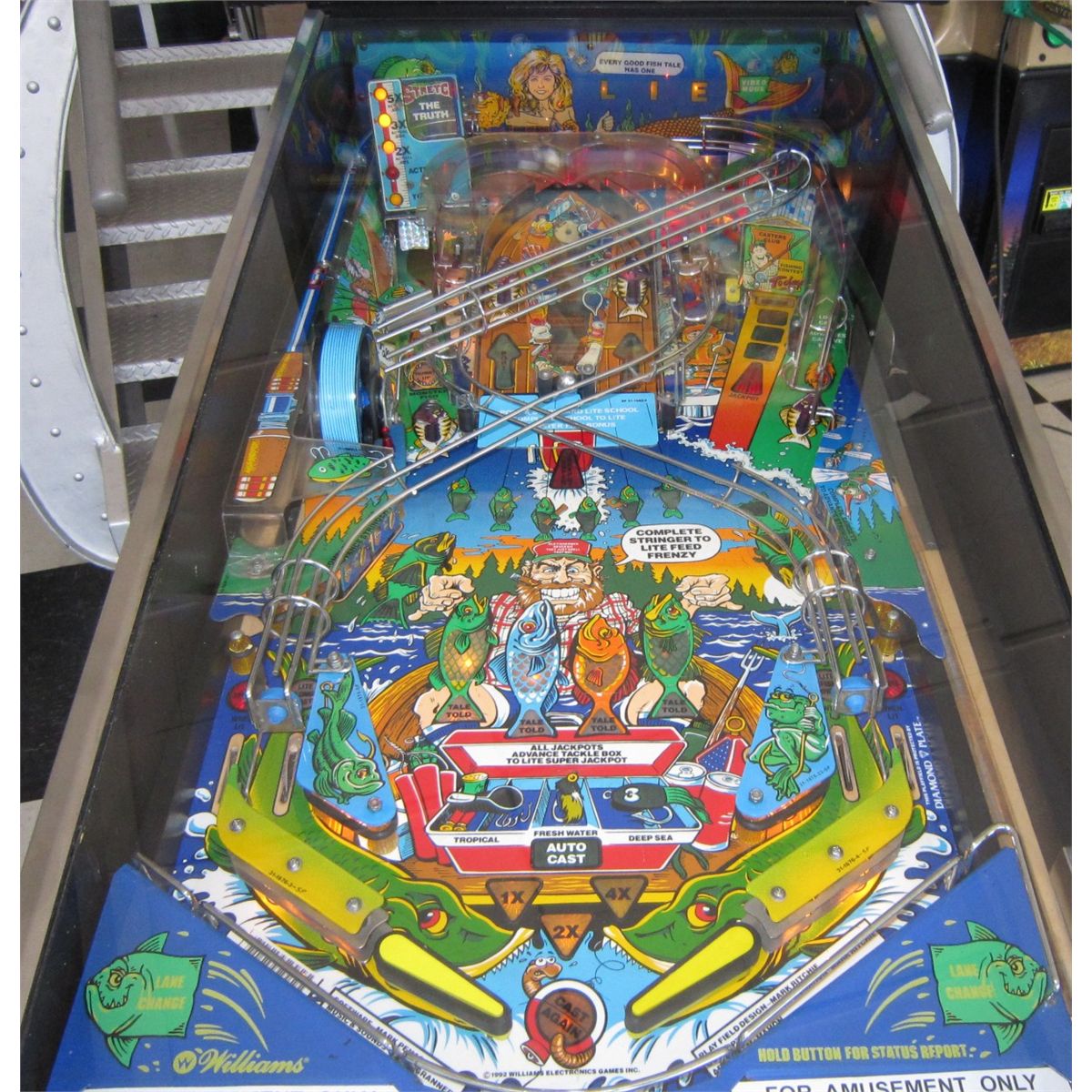 Fishing is fun in this crazy game. You can 'Rock the Boat', tell a lie, fast cast a ball into the ball lock, monster fish (hurry-up mode) and feeding frenzy. Features ramps, a cool video mode and super jets. It also has the moving fish topper. It plays great! We have restored this game with all brand new cabinet art, new chrome legs and new playfield glass. It has been shopped with the playfield cleaned and polished, rubber and burnt bulbs replaced.