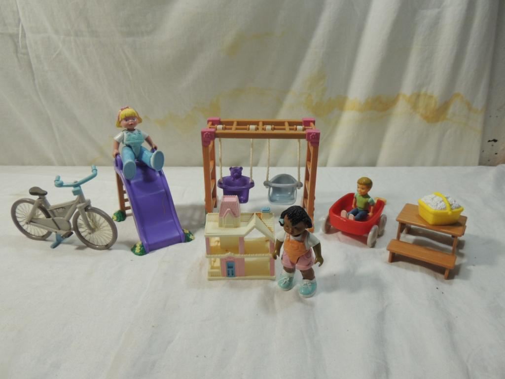 PLAY GROUND OUTDOOR BIKE, SWINGS, WAGON, PICNIC TABLE, SLIDE, CHILDREN DOLLS AS SHOWN SEE PHOTO FOR MORE DETAILS.