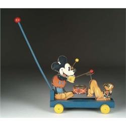 FISHER PRICE MICKEY MOUSE BAND.  Circa 1934, this is the first Disney toy Fisher Price produced.  Mickey and Pluto are mounted upon a wheeled wooden base with a stick push rod.  When pushed along the floor, Mickey strikes the drum and cymbal (on Pluto’s tail) in an alternating manner.  Marked on the side of the drum “MICKEY MOUSE BAND” & “FISHER PRICE TOYS # 530.”  The base is of painted blue wood with yellow wheels, and the figures have brightly colored paper litho applied to their wood frames.  Toy came directly from the original owner in a rural house in Pennsylvania and has never been cleaned or altered in any manner.  SIZE:  12” l. (not including push stick) CONDITION:  Very fine plus; minor edge wear to figures, and slight overall dustiness.  JL 1-4581 (900-1,100)