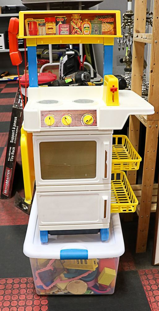 FISHER PRICE KITCHEN WITH ACCESSORIES - NEEDS SOME REPAIR