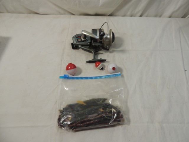 NICE LOT OF FISHING ITEMS. INCLUDING NICE DAIWA OPEN FACE SPINNING REEL, MOD #A-400RL, BOBBERS, RUBBER LURES, ETC. AS SHOWN.